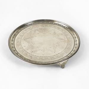 3736. Présentoir rond tripode à décor gravé et repoussé de frises d'en...