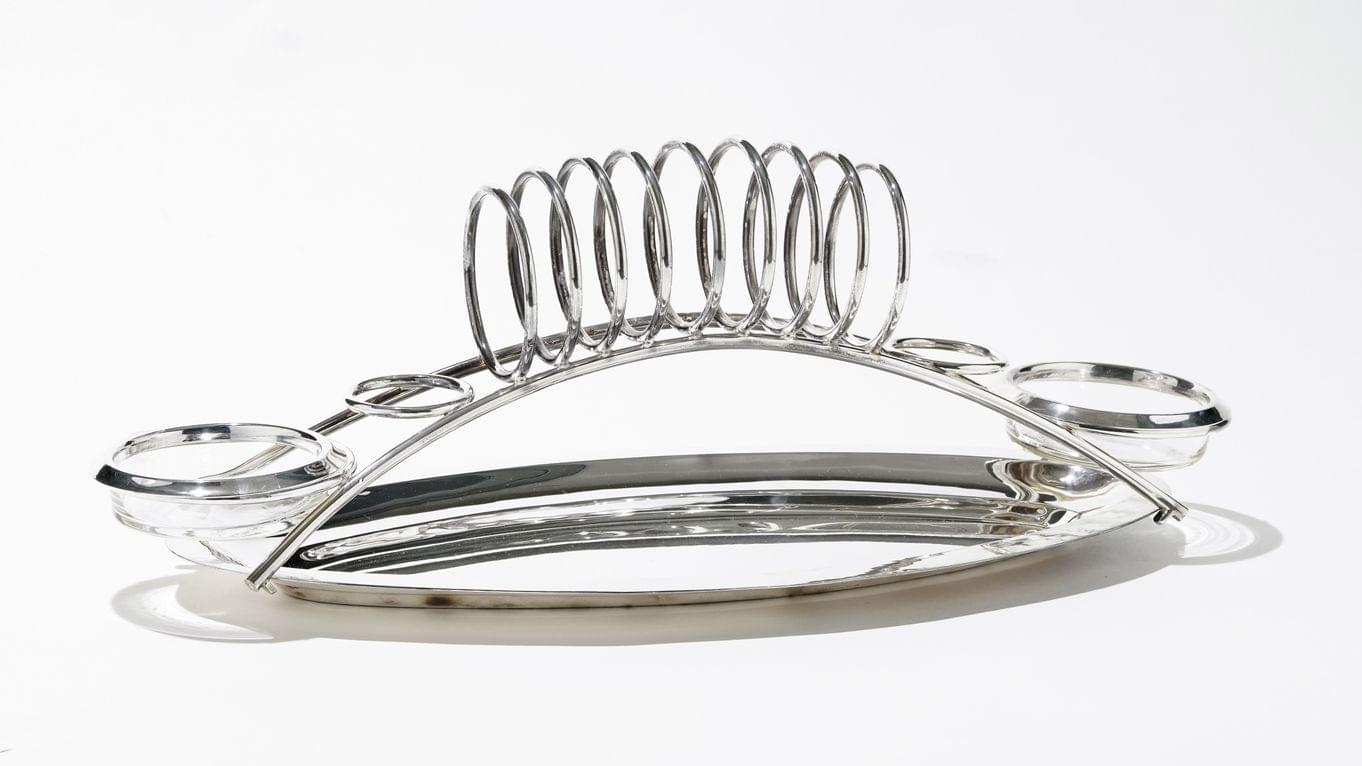 3169. Présentoir pour toasts à saumon formé d'un grand porte-toast arqué supportant deux coupelles et d'un plateau ovale à bordure droite