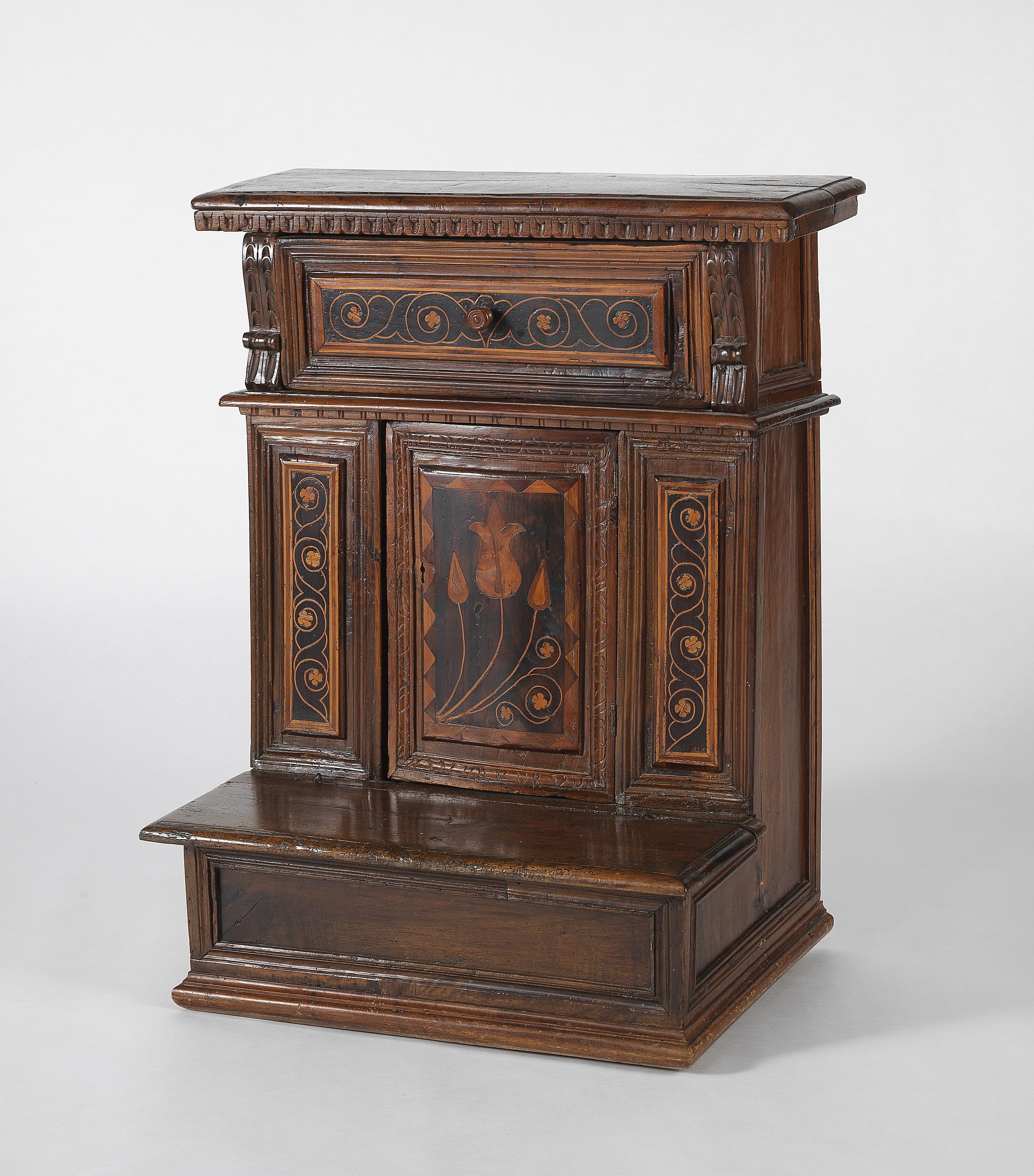 Bois fruitier et bois clair à décor marqueté, 91x73x48 cm