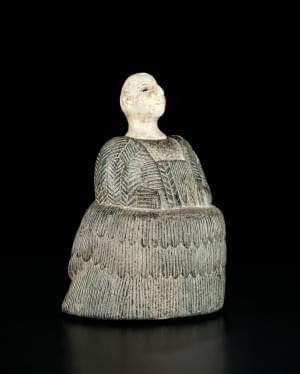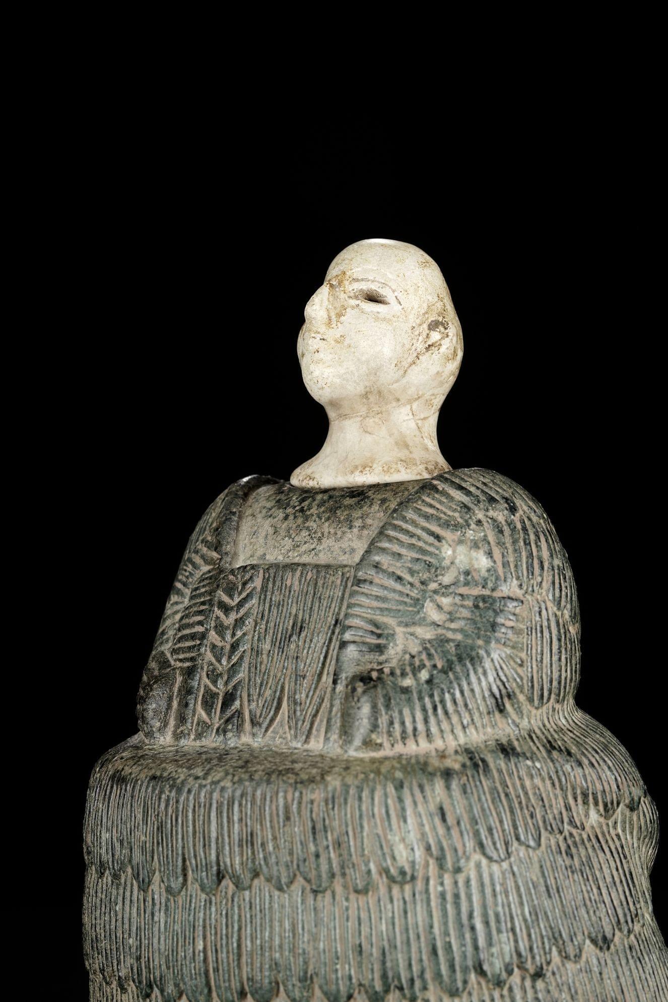 Statuette de femme vêtue d'un kaunakès, stéatite et calcaire, H 16 cm. Cette statuette est composée de deux parties emboitées en deux matérieux différents. Elle fait partie d'un groupe homogène de sculptures féminines communément appelées "princesses de Bactriane" dont quelques musées dont Le Louvre possèdent de rares exemplaires. La coiffe ainsi que le décolleté de notre exemplaire sont malheureusement perdus. Provenance: Collection privée suisse