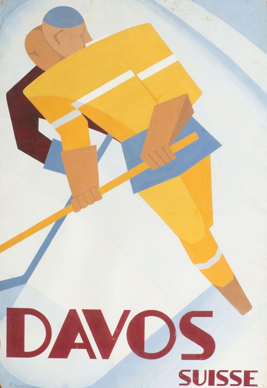 Davos gouache signée R. Burkhardt, circa 1930, 98x68 cm