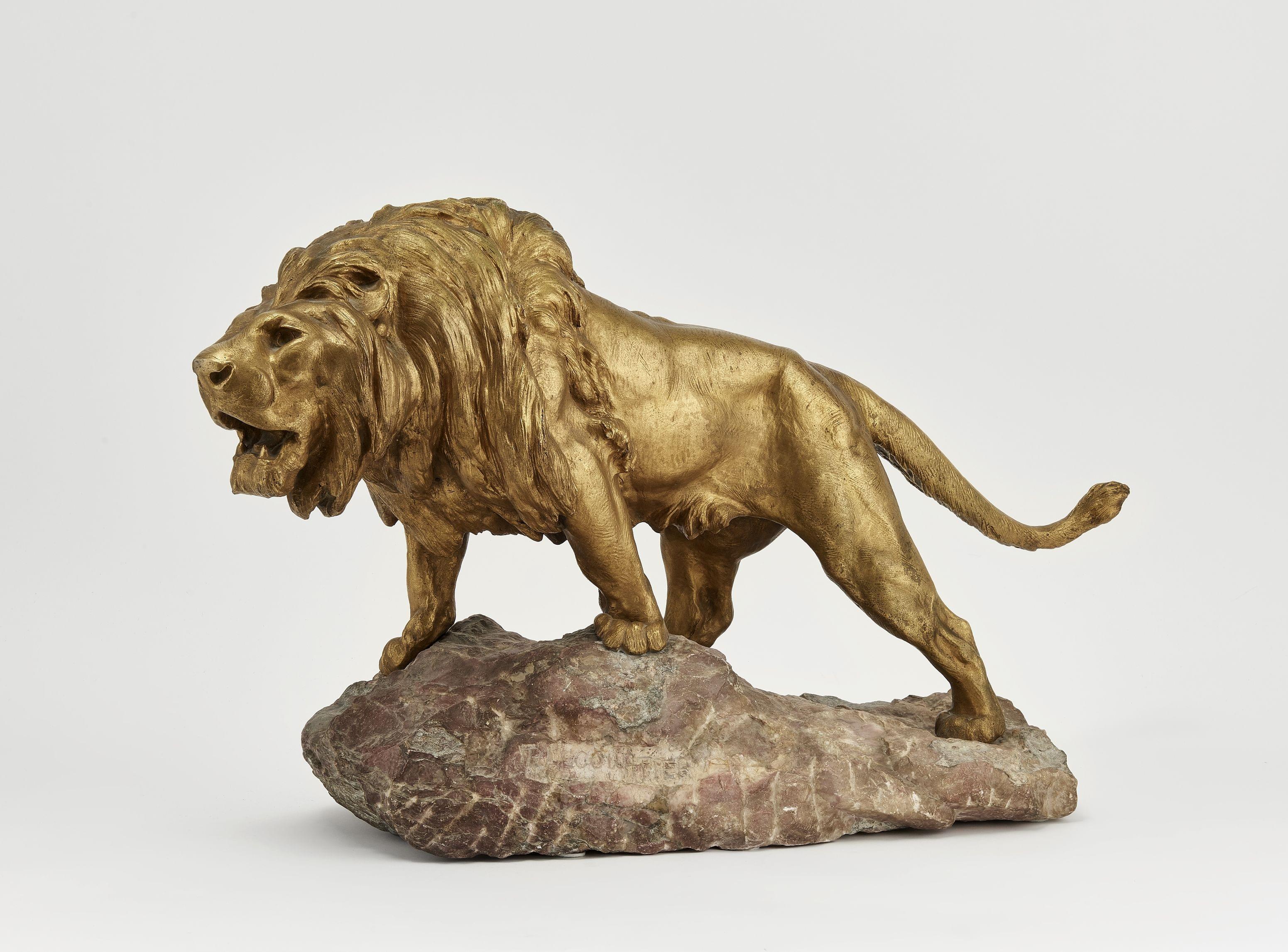 Lion rugissant, bronze doré et marbre, L 75 cm