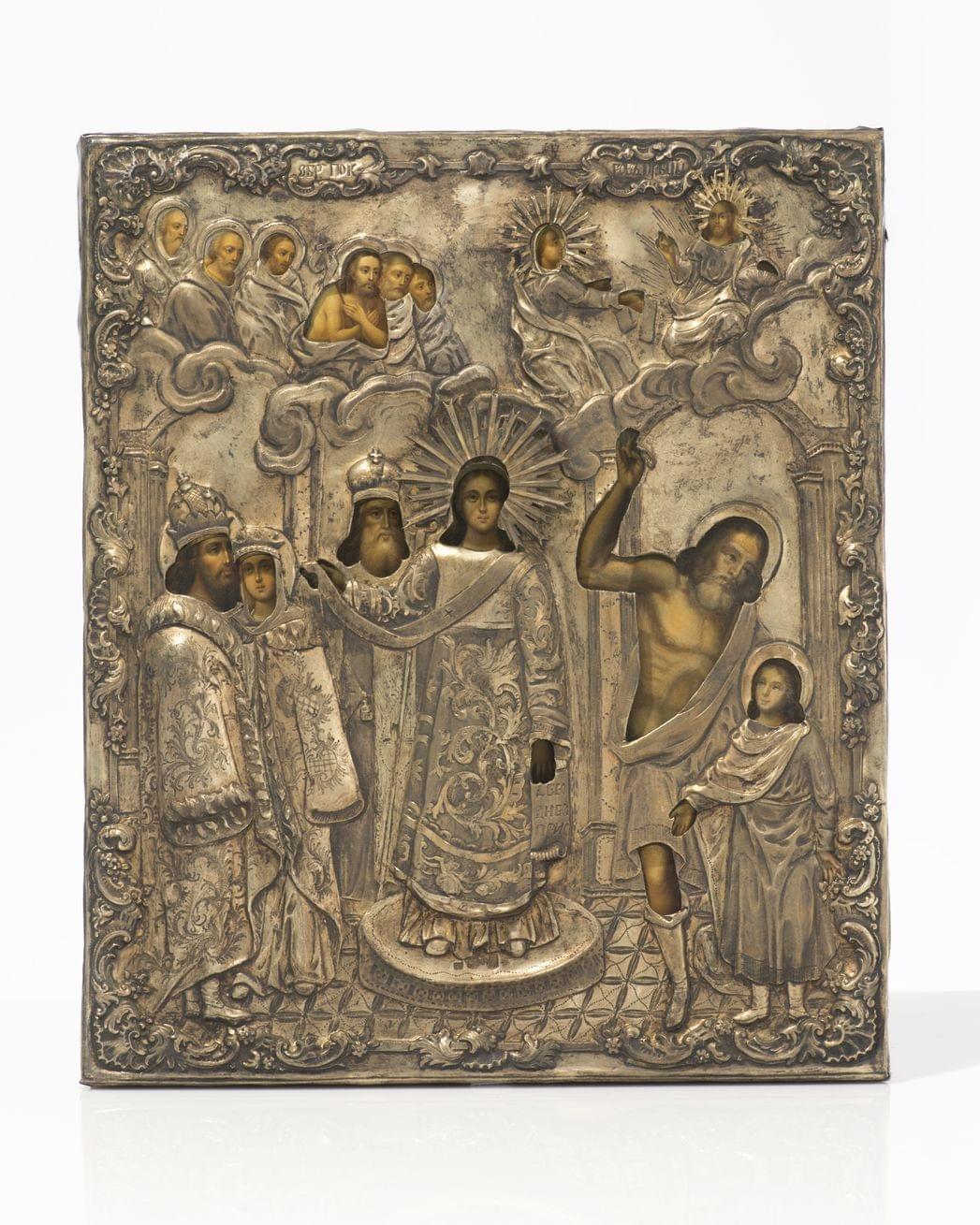 Icône sur panneau et oklade en argent, orfèvre B.C, contrôleur A...