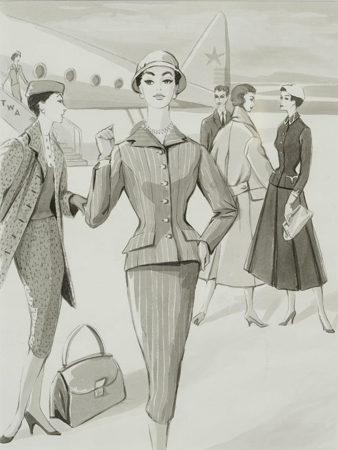 Elégantes devant un avion de la compagnie TWA, lavis d'encre sur papier, 40x30 cm