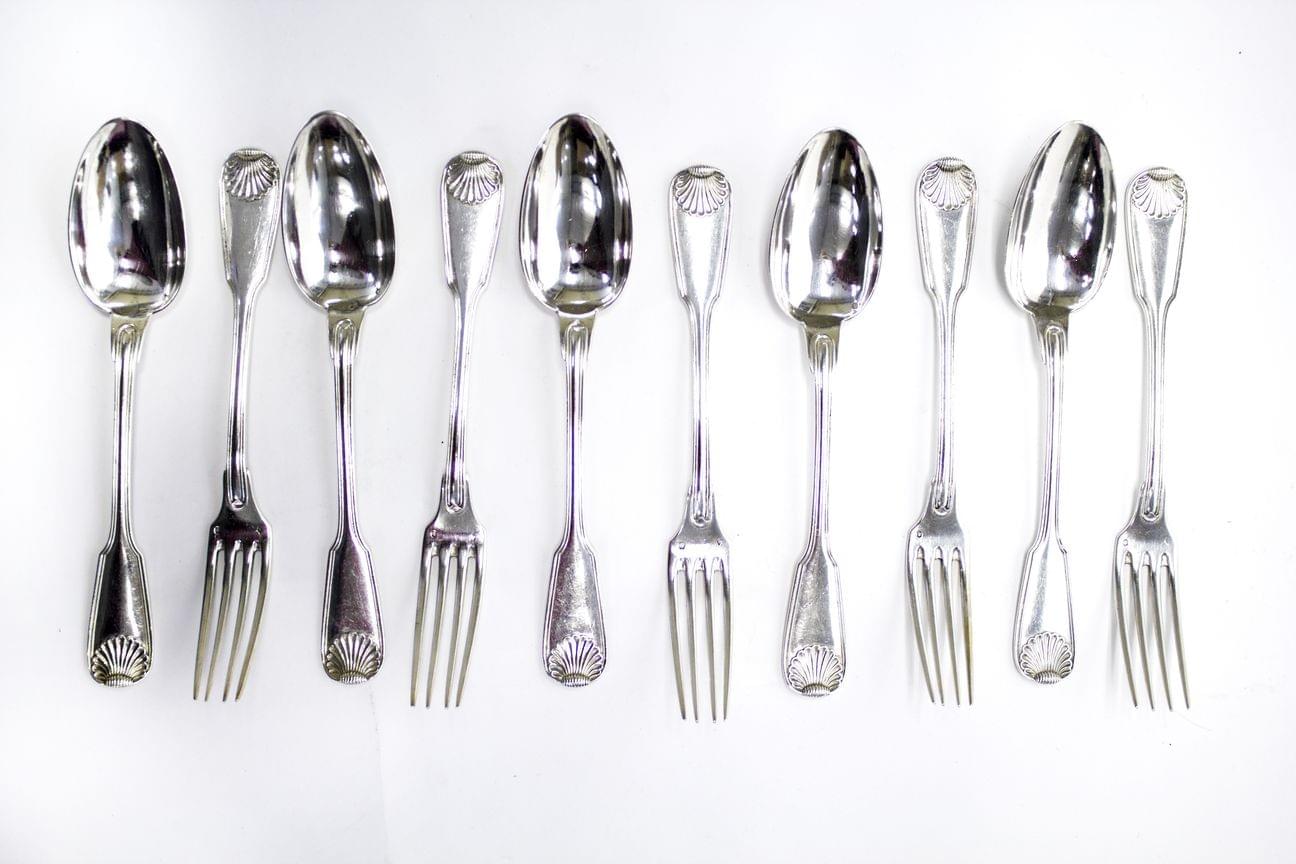 3461. Puiforcat, cinq fourchettes et cinq cuillères à motif de coquille
