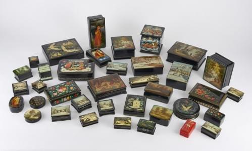 Papier bouilli laqué noir à décor polychrome de paysages, scène...