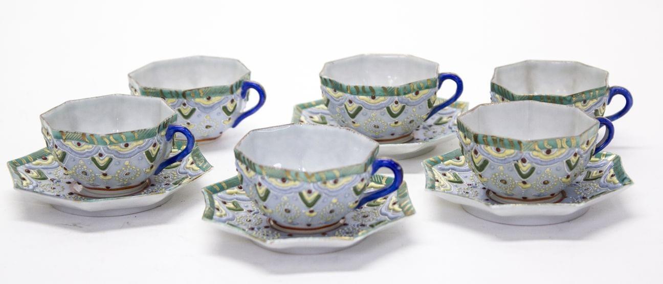 Porcelaine à décor émaillé de motifs Art Déco sur fond bleu ciel, Japon, milieu XXe s