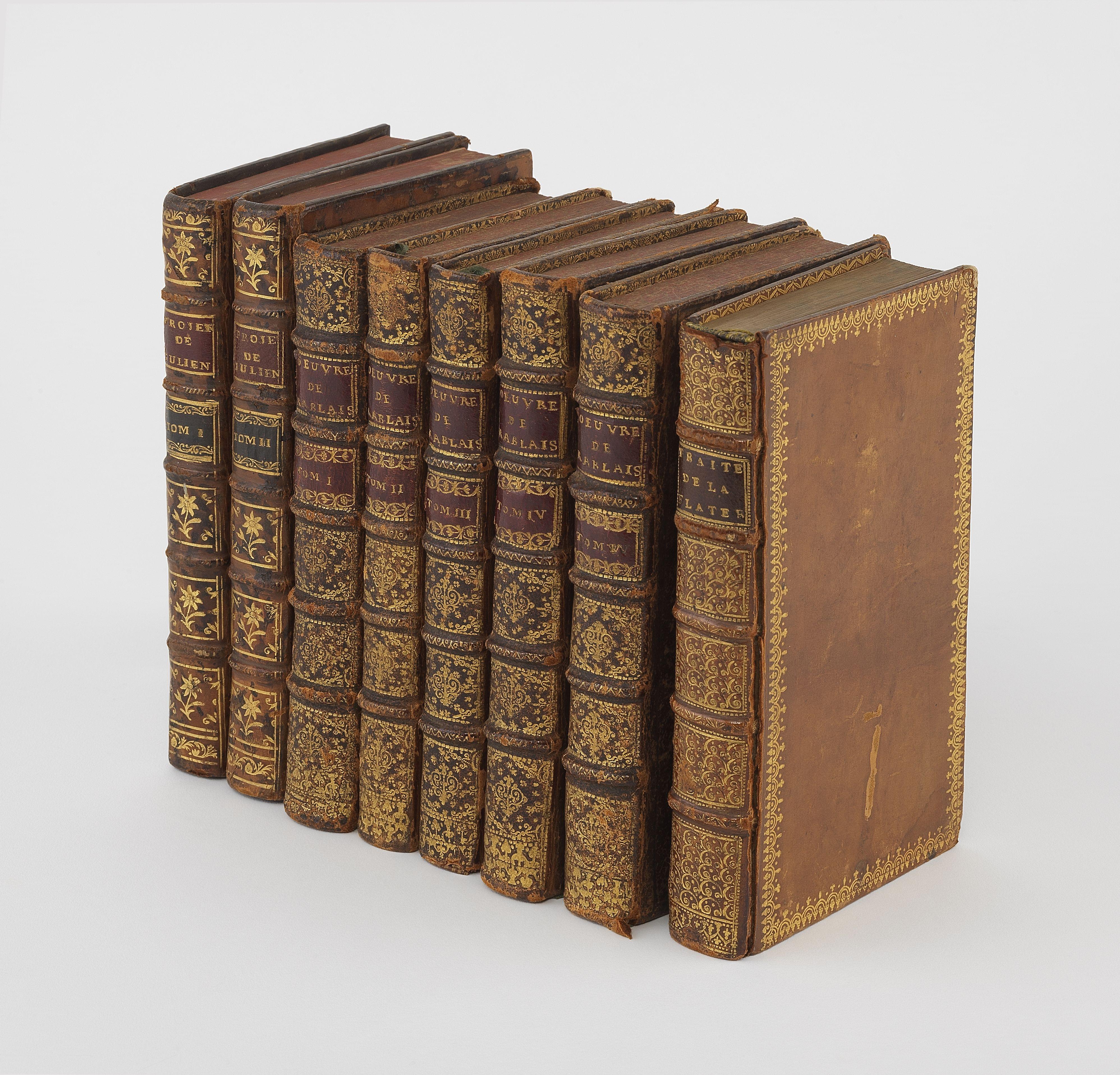 Cinq vol. in 12, veau fauve, dos à nerfs ornés, tranches rouges. Reliure de l’époque. - WARBURTON : Dissertation sur les Tremblements de terre et les Eruptions de feux qui firent échouer le projet formé par l’empereur Julien de rebâtir le temple de Jérusalem... Paris, Le Mercier, 1754 ; deux vol. in 12, veau fauve jaspé orné. Reliure de l’époque.- [GIRARD DE VILLETHIERRY] : Deux Traitez, l’un de la Flaterie et des Louanges, l’autre de la Médisance. Paris, Ch. Robustel, 1701 ; veau blond orné de l’époque (mors fendu).