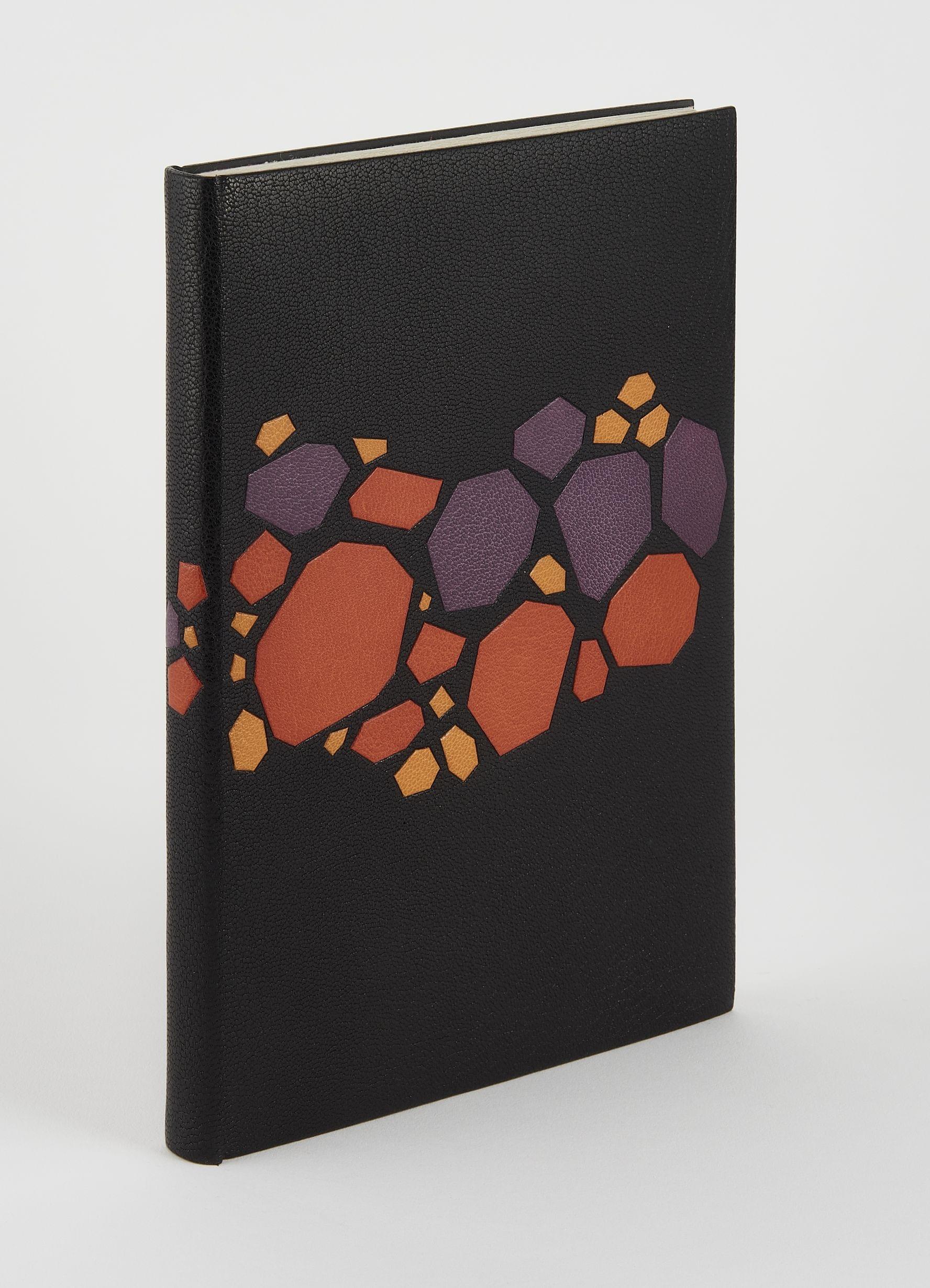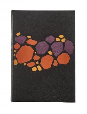 In 8°, plein maroquin noir à décor d'un rang de galets polyédriques en maroquin mosaïqué violet, corail ou citron. Contreplats doublés de veau noir, gardes de daim saumon, coffret.