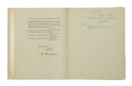 In folio en ff. sous chemise et double emboîtage. Illustrations de Max HUNZIKER. Ex. n°34 comportant une suite sur Japon de toutes les illustrations, et signé par Ramuz et l'artiste. Bel envoi de l'auteur à Madame S. Maurice- Hofer daté du 20 mai (19) 43.