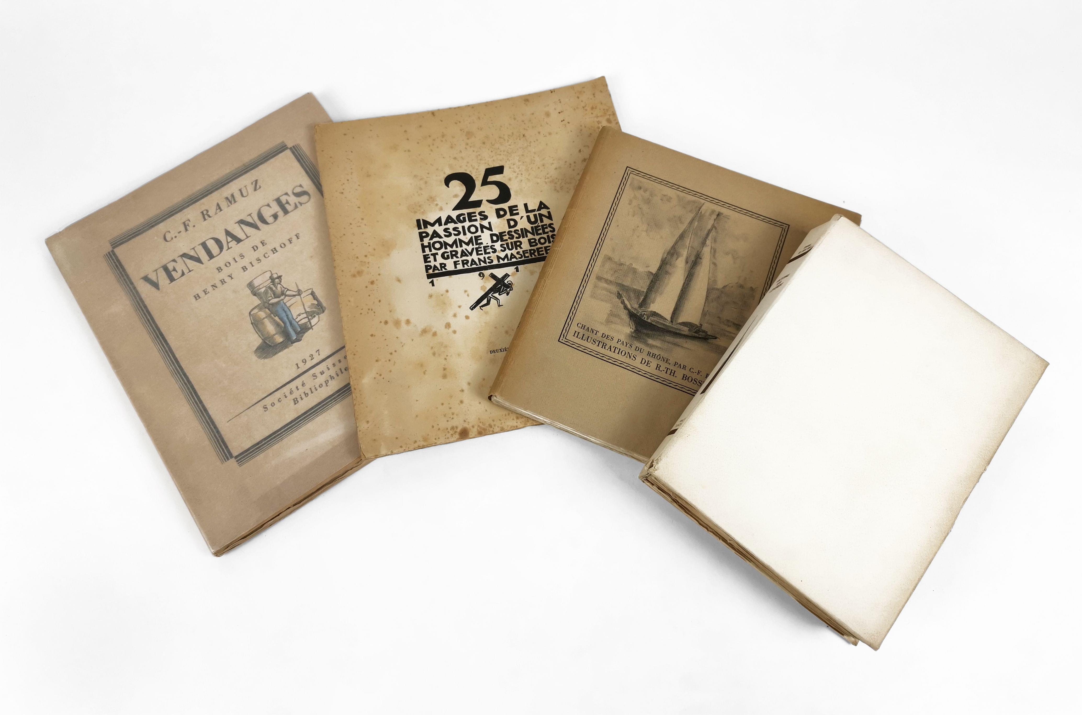 In 4° broché, couverture illustrée. Un des 300 ex. num. sur Hollande, il porte le n° 183, signé par le poète et l’artiste. Bel exemplaire malgré quelques rares rousseurs et piqûres.On joint : - MASEREEL (Franz) : 25 Images de la Passion d’un Homme dessinées et gravées sur bois par Franz Masereel. Deuxième édition, chez l’auteur, s. d. ; in 4° broché, couverture imprimée. Cette seconde édition n’a été tirée qu’à 153 ex. tous num., celui-ci porte le n° 40 (rousseurs sur la couv.). – RAMUZ (Ch.- F.) : Chants des Pays du Rhône. Paris, Les Bibliophiles régionaux, 1929 ; in 4° en feuilles sous chemise. Ill. de BOSSHARD. Ex. num. – HUNT (sir John) : Victoire sur l’Everest. Paris, Amiot-Dumont, 1953 ; in 8° broché. Exemplaire num.