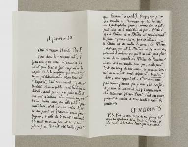 Il est illustré de vues à pleine page en couleurs d'André ROZ, d'une suite des 28 illustrations, d'une suite du premier état de quelques planches, de 3 dessins originaux de Roz ayant servi à l'illustration, d'une aquarelle de Paul Baudier qui a gravé sur bois les dessins de Roz de 4 L. A. S. d'André Roz, d'une L.A.S. de 2 pages in 8° datées du 11 janvier (19)38 écrites par Ramuz au souscripteur de l'ouvrage, de deux L.A.S de Paul Baudier enrichies de dessins à l'encre, d'une lettre de Maurice Bussillet, collectionneur lyonnais, d'une L.A.S. du bibliophile genevois Albert Natural et du menu de la société du 23 février 1939 à Paris, à l'hôtel Plaza-Athénée.