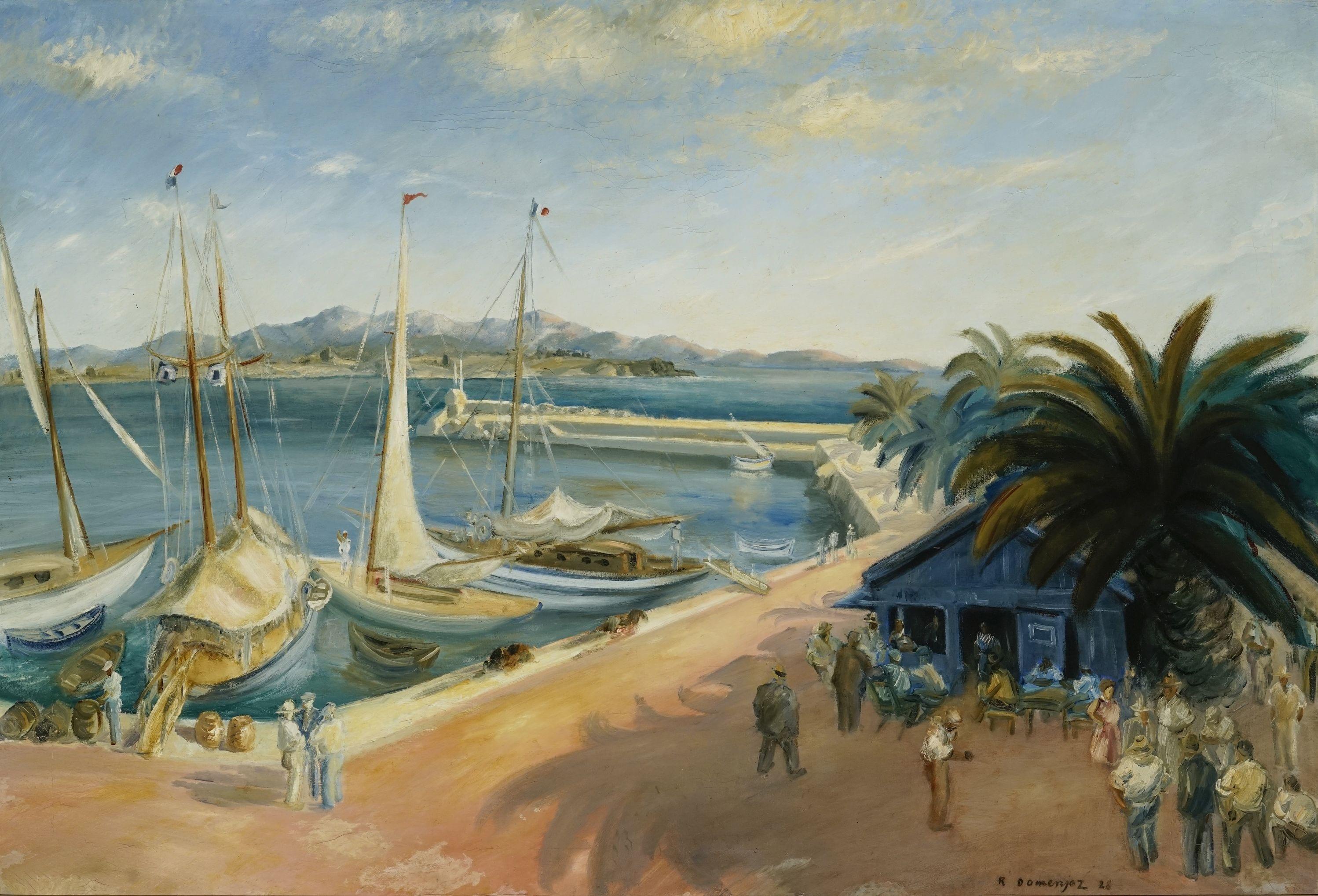 Port de Méditerranée, huile sur toile, signée et datée 28, 87x129 cm