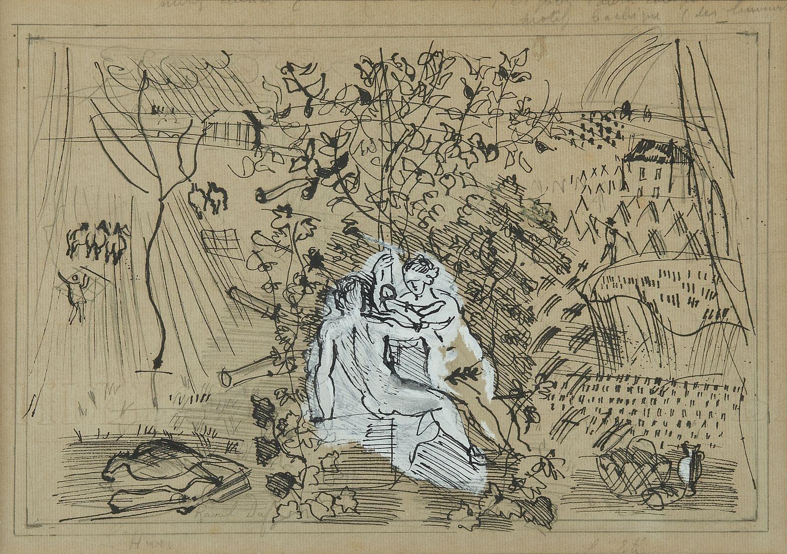Scène bachique, encre et gouache sur papier, circa 1948, signée, 26x37 cm. Un certificat établi par Madame Guillon-Lafaille et daté du 3 novembre 2015 accompagne cette œuvre. Ce dessin sera reproduit dans le prochain Catalogue Raisonné des dessins de Raoul Dufy actuellement en préparation.