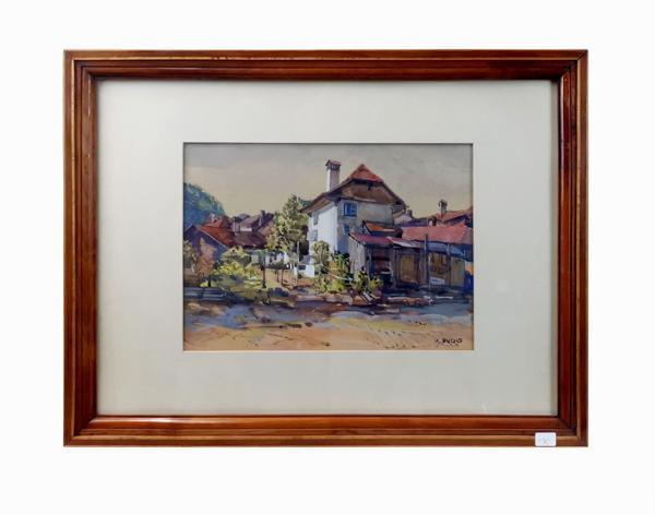 Chemin dans la campagne, gouache sur papier ,signée, 26x31 cm