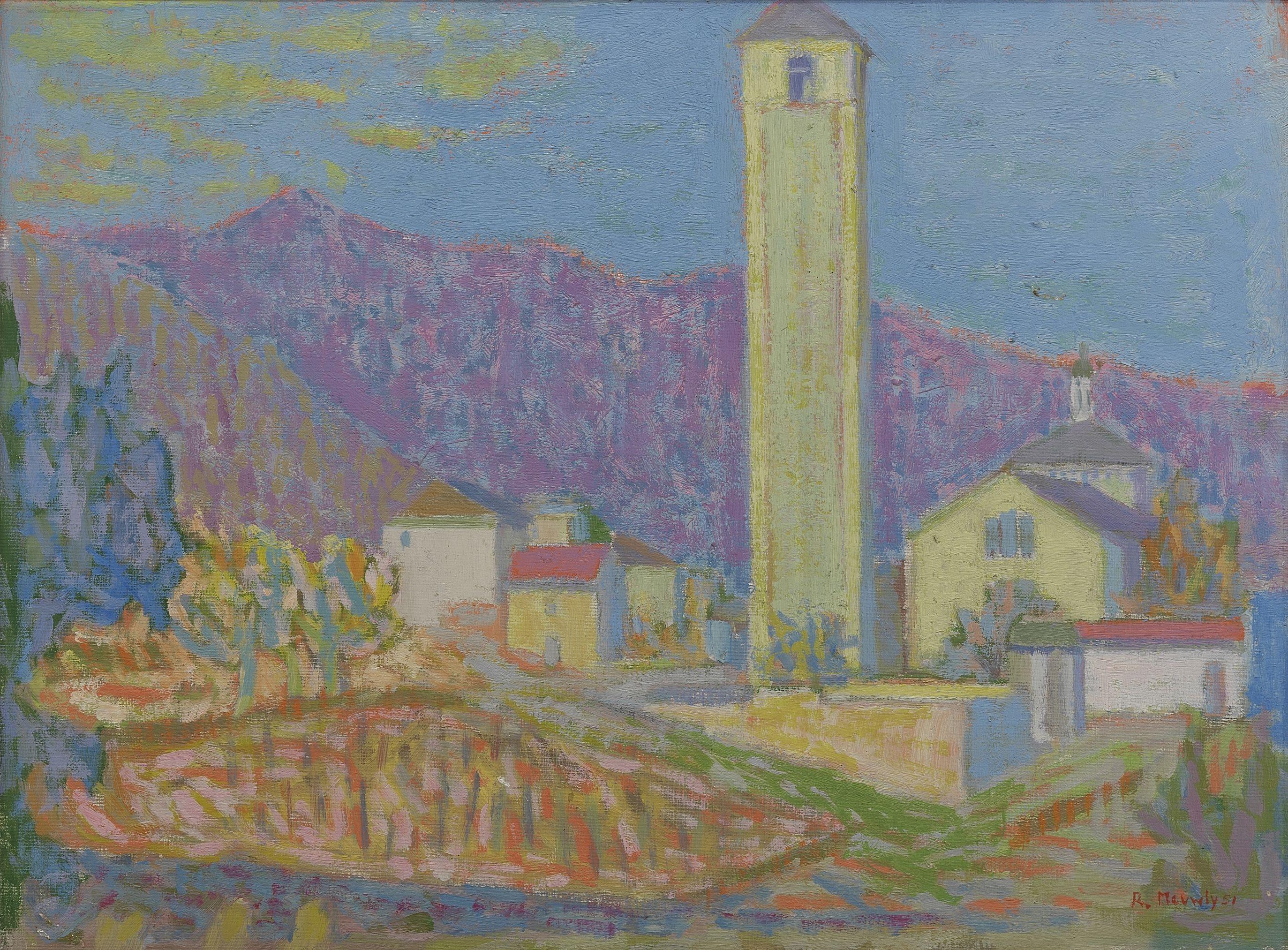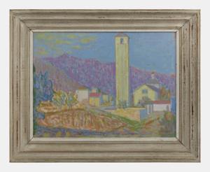 Eglise dans un paysage, huile sur toile, signée et datée 1951, 54x73 cm