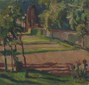 Jardins au Breitfeld, huile sur carton, signée, 35x36,5 cm