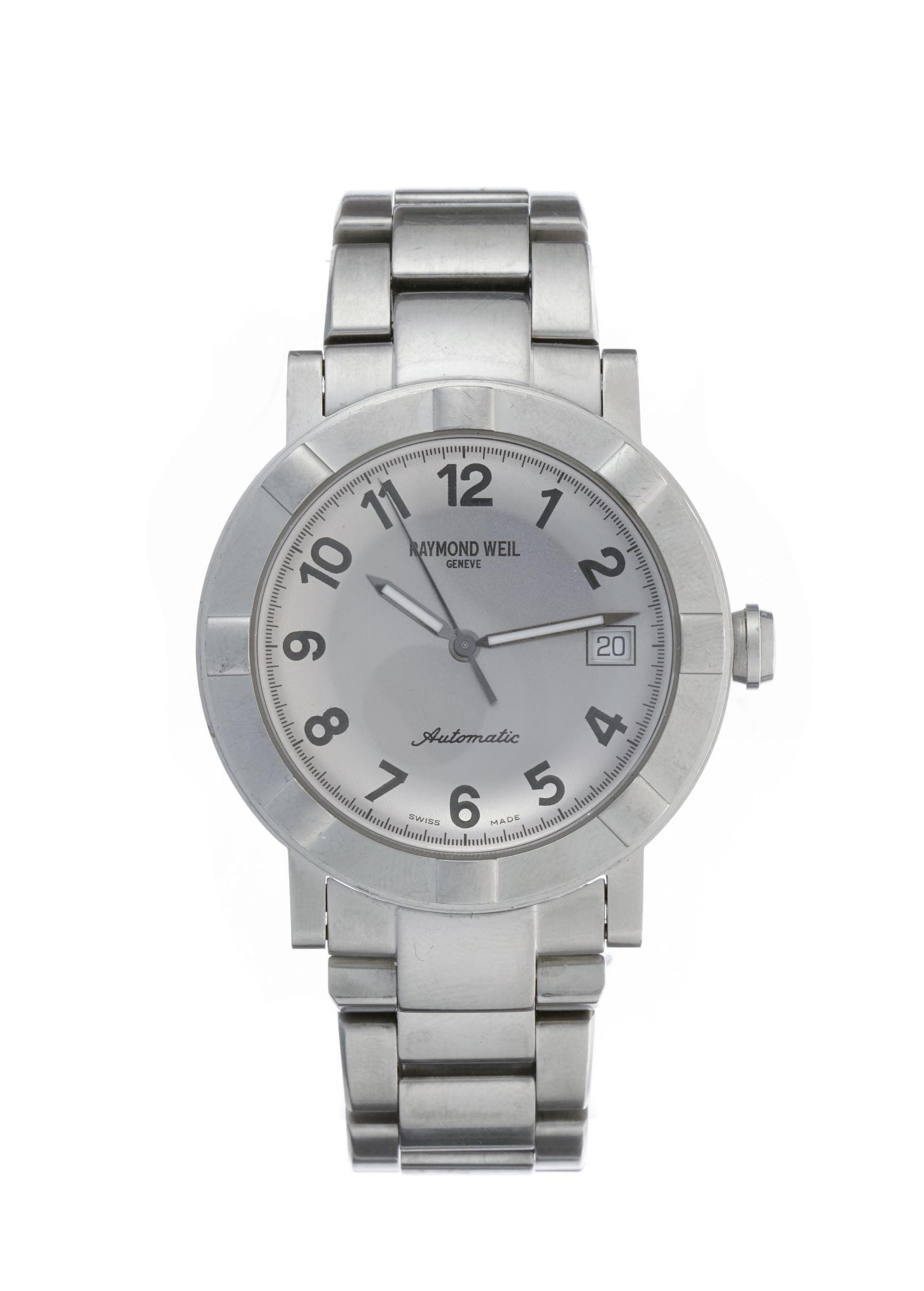 Cadran gris, aiguilles luminescentes et chiffres arabes noirs, date à guichet à 3h, acier, D 37 mm