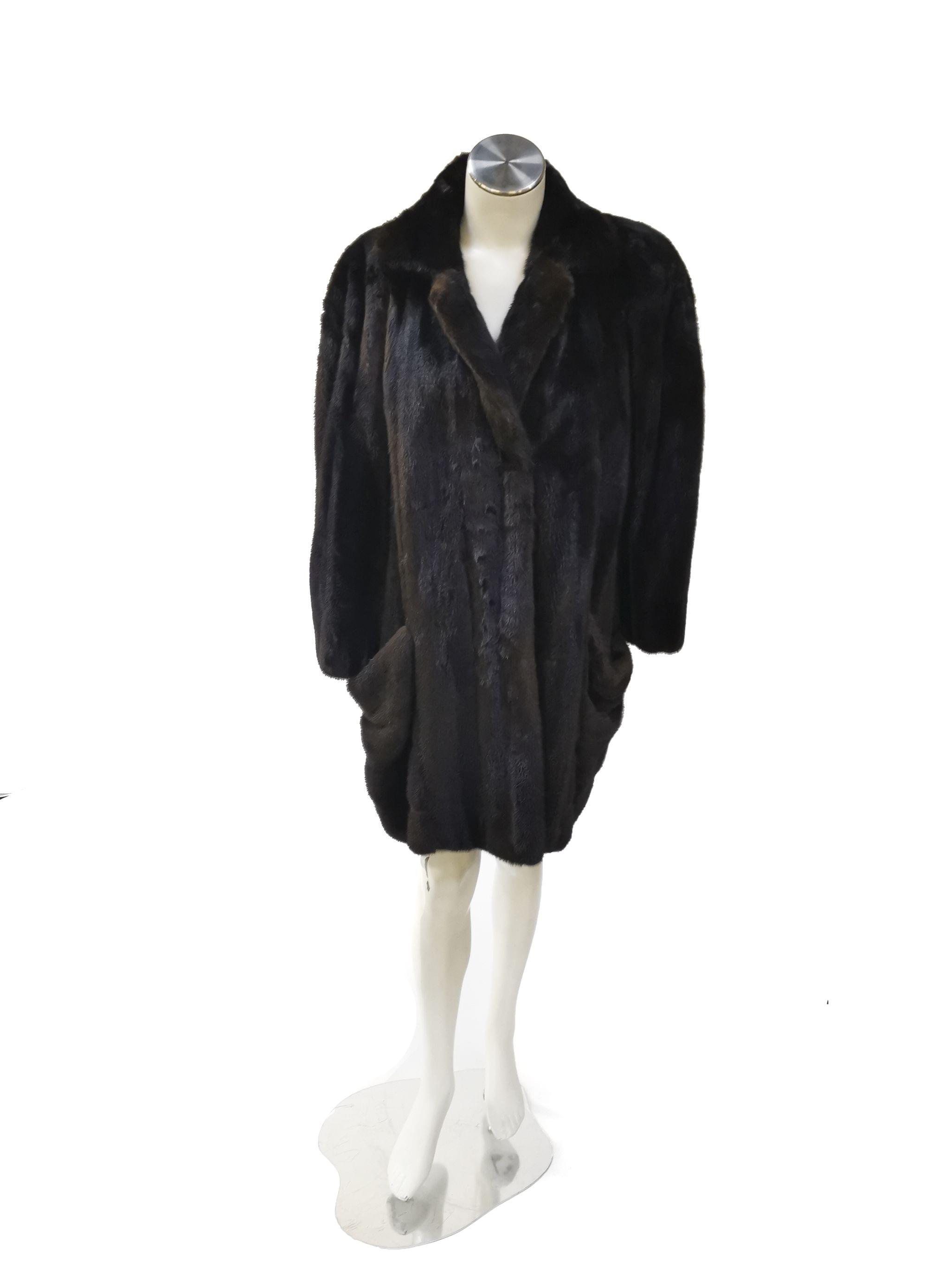 Vison marron, intérieur en tissu noir, grandes poches latérales, fermetures à crochets