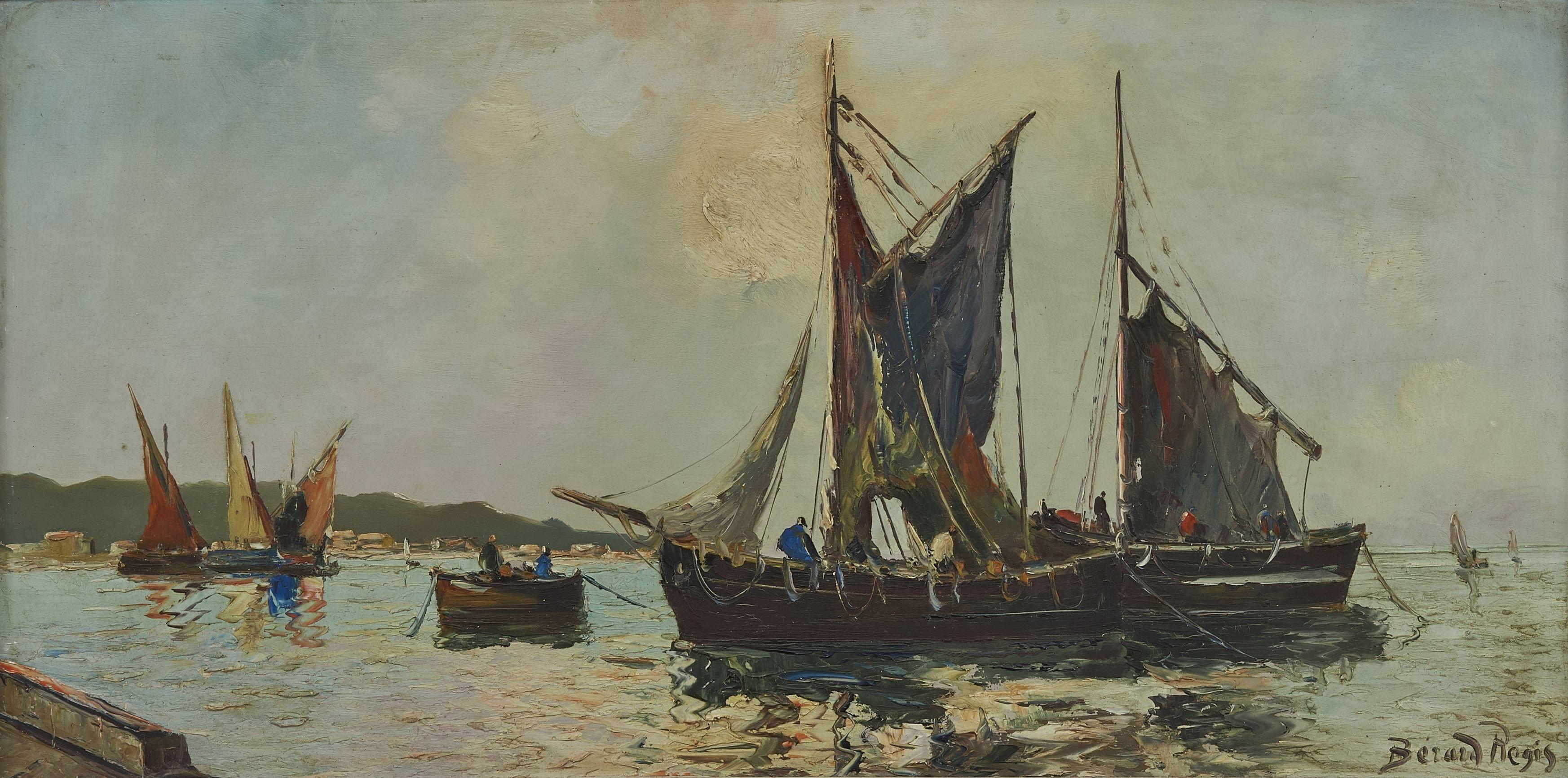 Vue avec bâteaux de pêche, huile sur pavatex, signée, 40x80 cm