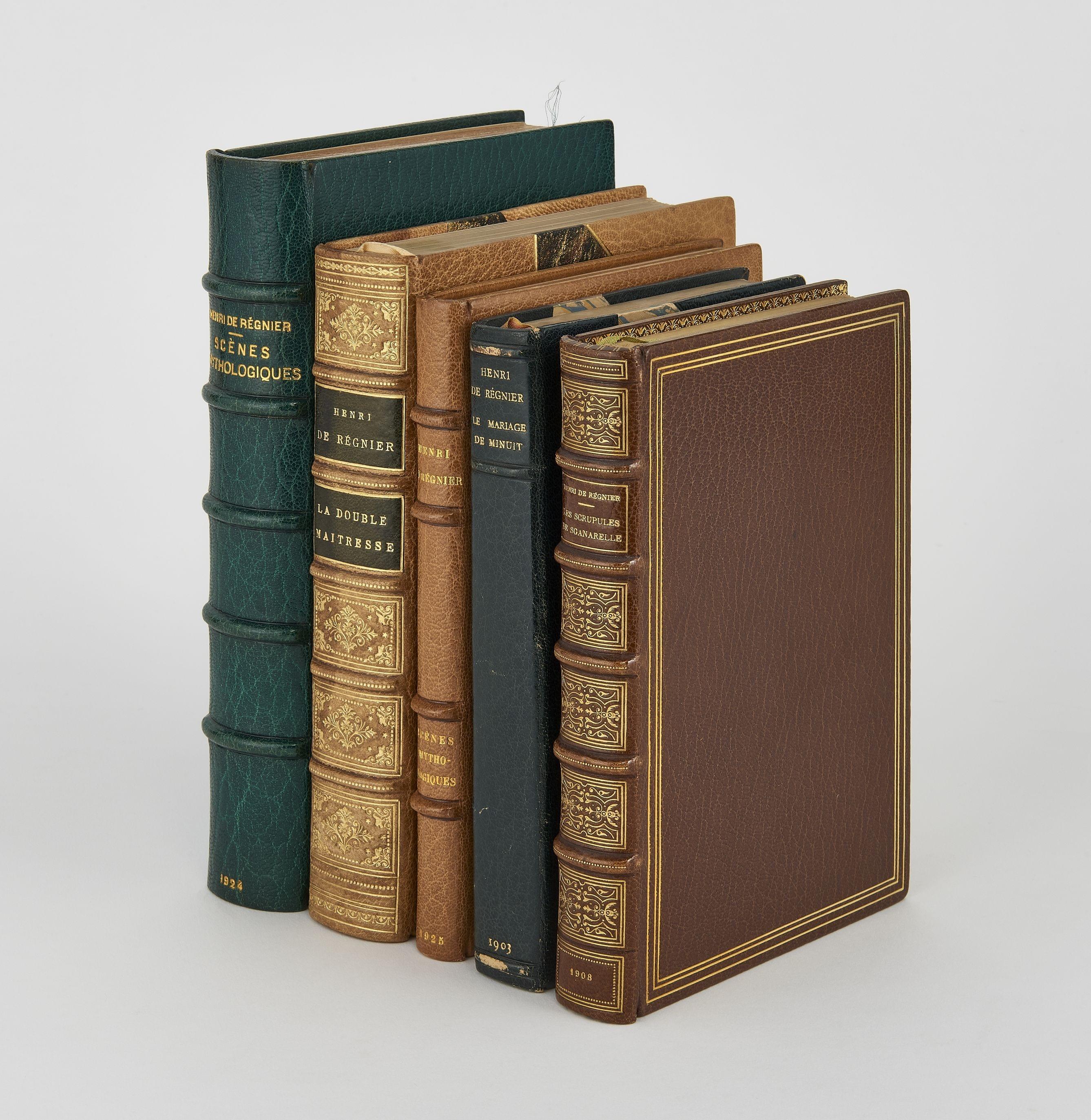- REGNIER (Henri de): Les Scrupules de Sganarelle. Paris, 1908; in 12, maroquin tabac orné de CANAPE. Ed. or. Ex. num sur Hollande.