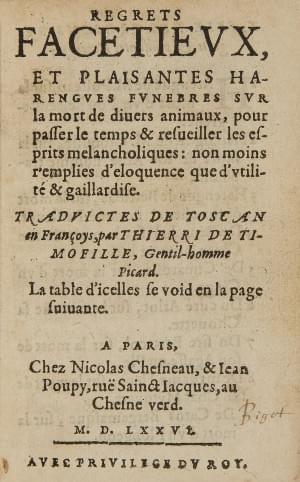 230. Regrets Facétieux et Plaisantes Harengues Funèbres sur la Mort de Divers Animaux… Paris, Nicolas Chesneau et Jean Poupy, 1576;