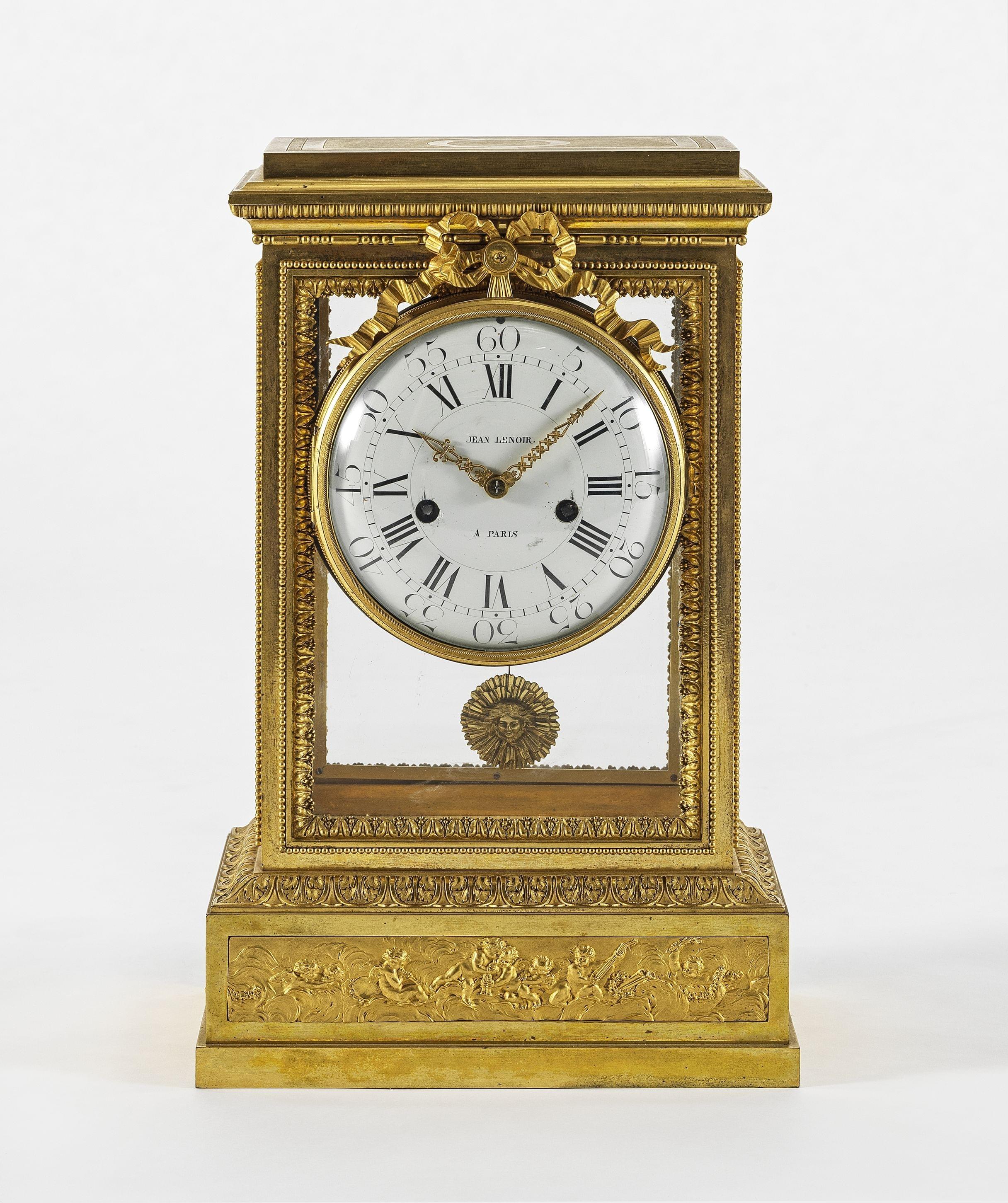 Bronze doré et finement ciselé, cadran émaillé blanc signé Jean Lenoir à Paris, base ornée de trois frises en bas-relief à décor de putti, 49x32x19 cm