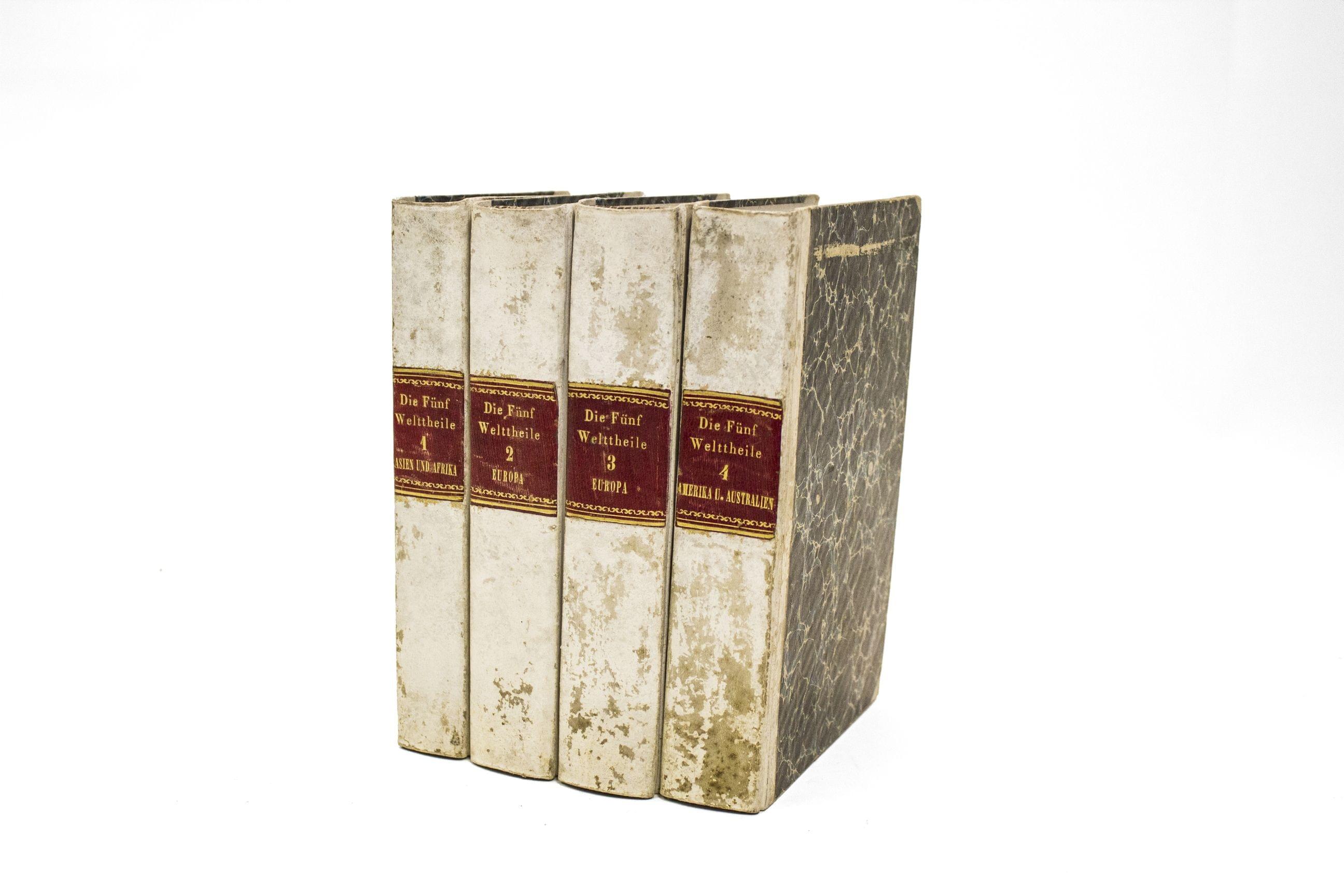 EISER (Heinrich) : Die Fünf Weltheile. Hildburghausen, vers 1850 (1851) ; 4 vol. in-8°, demi-vélin, pièces de titre. Nombreuses vues gravées en noir et cartes en couleurs hors-texte