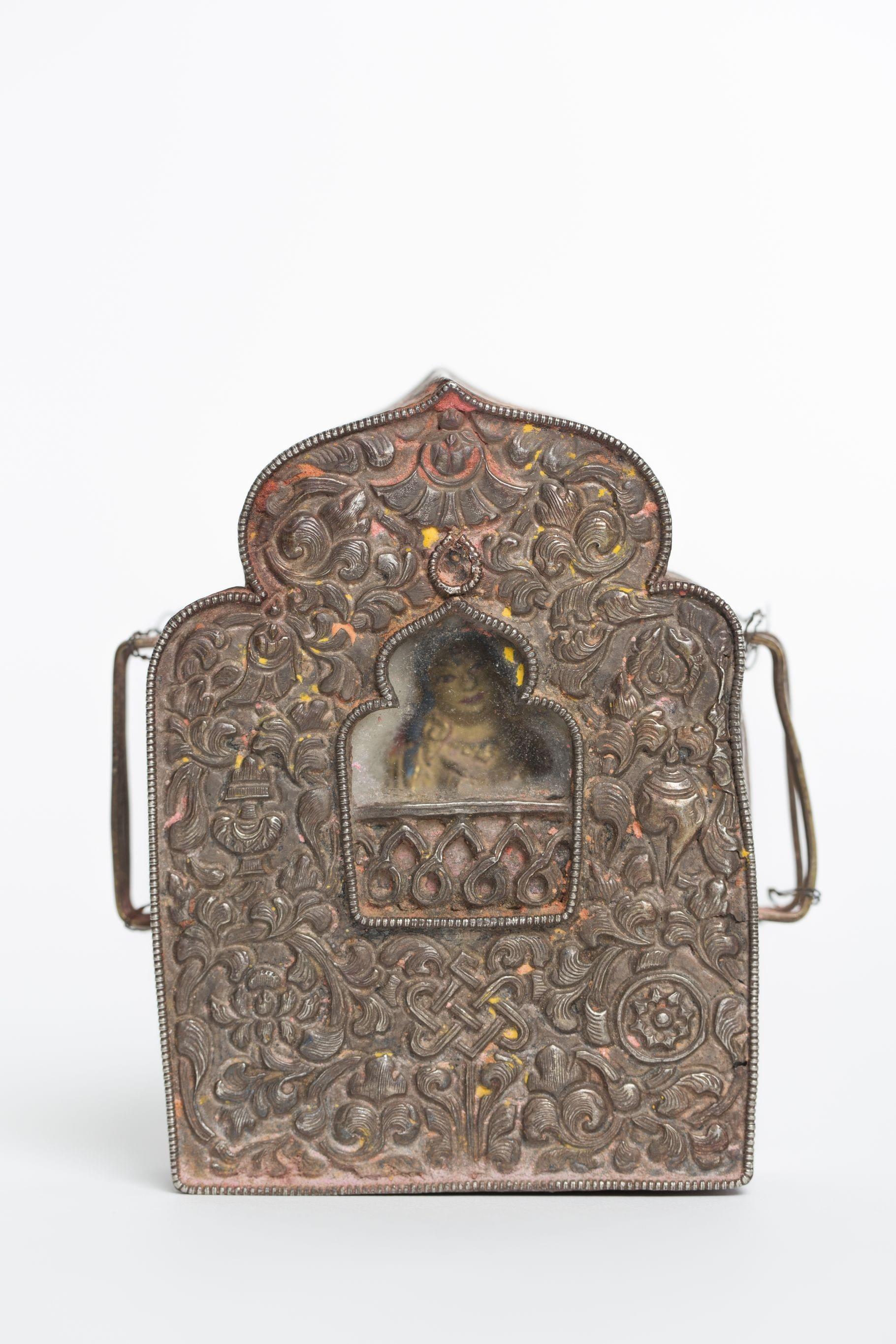 Cuivre repoussé abritant une figurine dorée , 11x9 cm