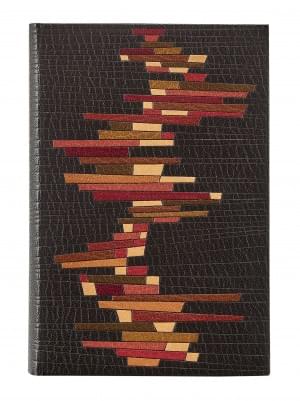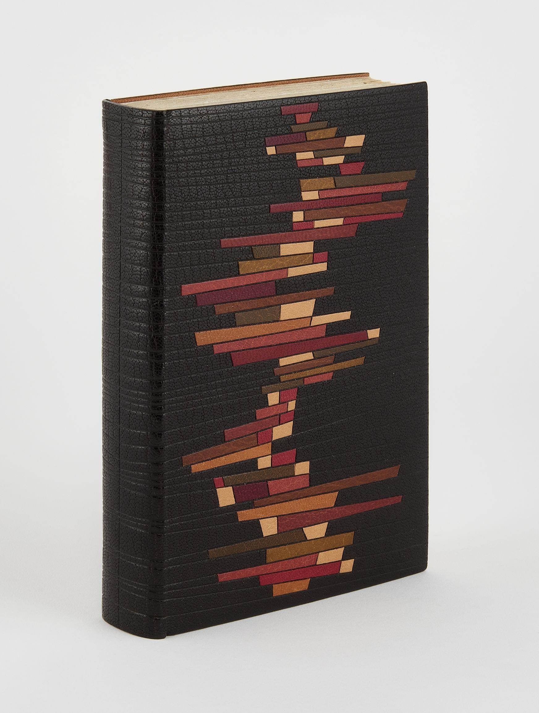 In 12, mar. brun à décor de filets estampés et d'un décor géométrique de filets gras de maroquin de couleurs rouge, brune, ivoire, havane, tabac… mosaïqués, garde de maroquin havane, tête dorée, couv. et dos cons, coffret.