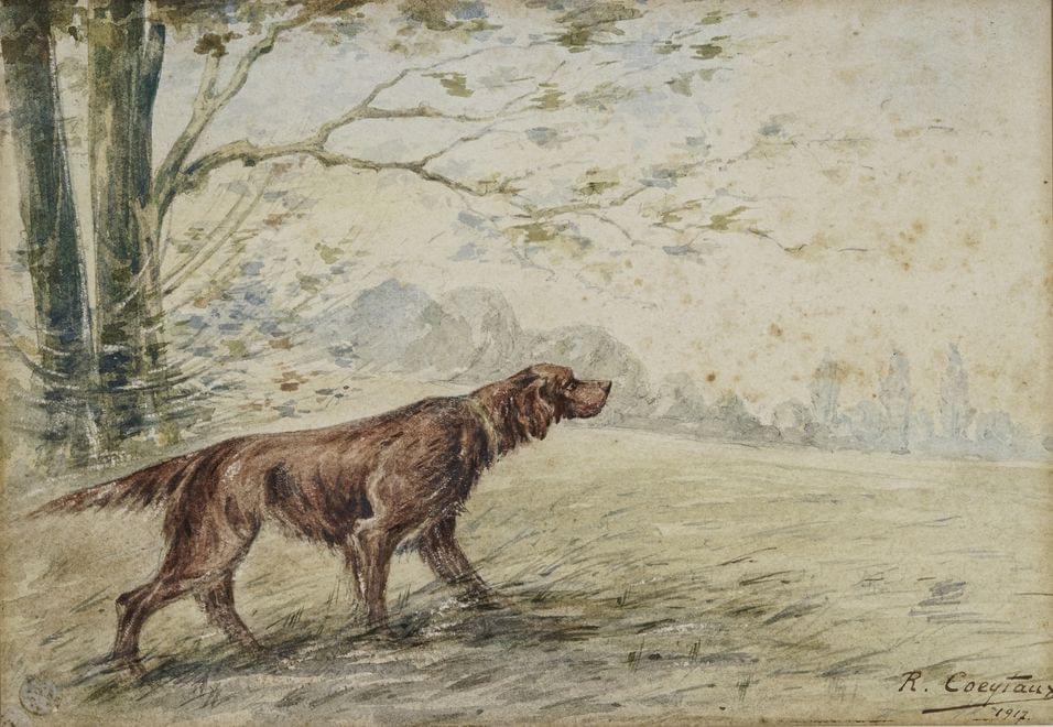 Chien de chasse, aquarelle sur papier, signée et datée 1917, 18,5x26,5 cm