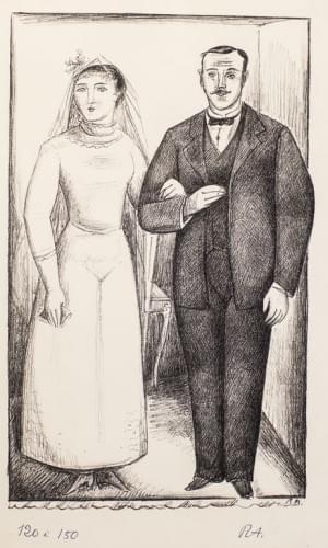 Femme au parapluie et jeunes mariés, deux lithographies, signées...