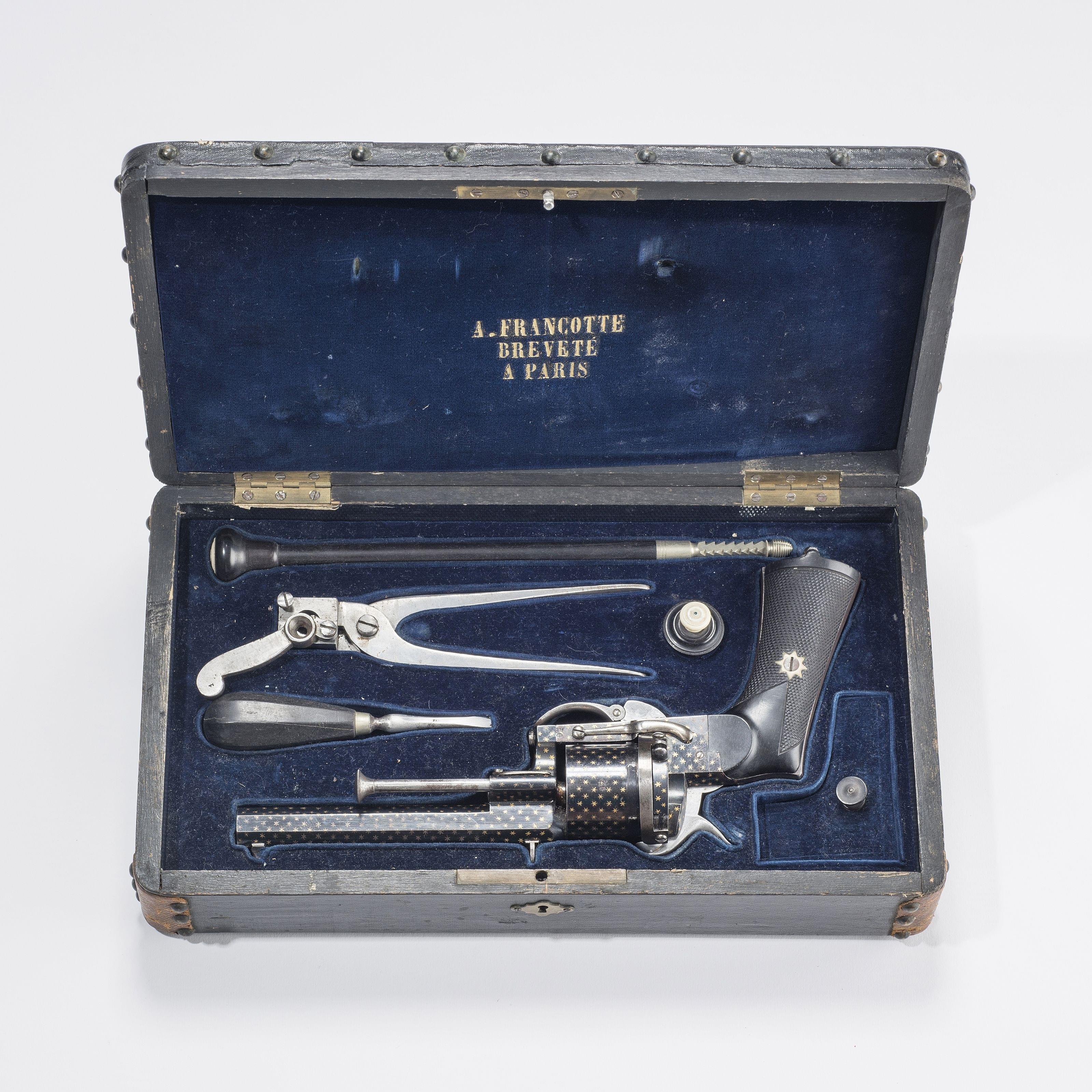 Calibre 12 mm, Canon à pans orné d'étoiles dorées, marqué "A.Francotte Bte" et frappé "E.Lefaucheux Invr Breveté", barillet à six chambres, plaquettes de crosse en ébène quadrillé, coffret avec accessoires, vers 1870, L 24 cm