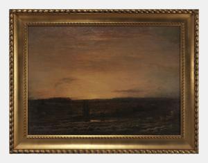 Paysage au coucher de soleil, huile sur toile, signée, 85x118 cm