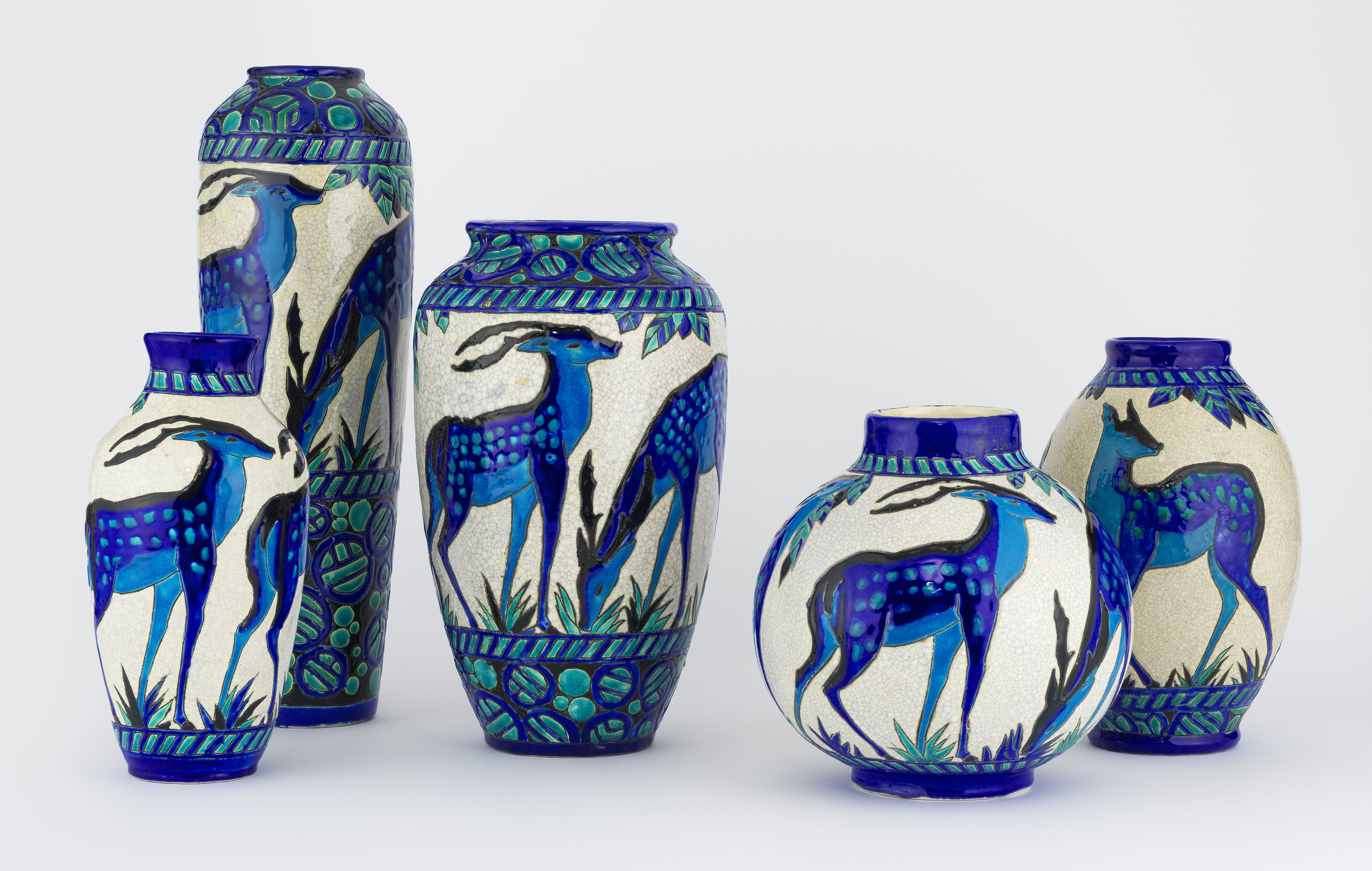 Suite de 5 vases ovoïdes à décor de daims, céramique émaillée po...