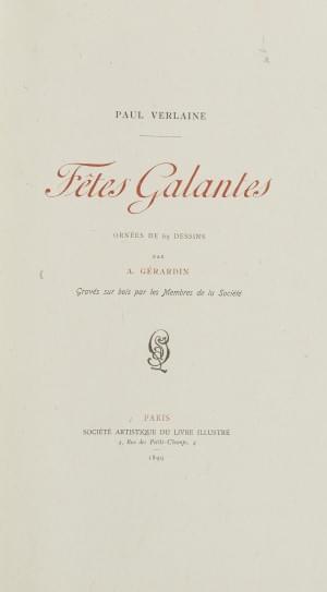 In 12, demi-chagrin rouge, dos lisse, tête jaspée, couv. Cons. Reliure moderne. Edition collective en grande partie originale ; plusieurs poèmes paraissent dans cette édition pour la première fois : Les Etrennes des Orphelins, Patience, Jeune Ménage, Mémoire… Importante préface originale de Paul Verlaine. En frontispice, l’éditeur a choisi deux dessins de Verlaine représentant Rimbaud. (Couverture supérieure largement restaurée sans atteinte au texte). On joint le vol. en ff. des Fêtes Galantes, de VERLAINE, Paris, Soc. Artistique du Livre illustré, 1899 ; in 8°, sous chemise et portefeuille. Un des 75 ex. num. sur Chine.