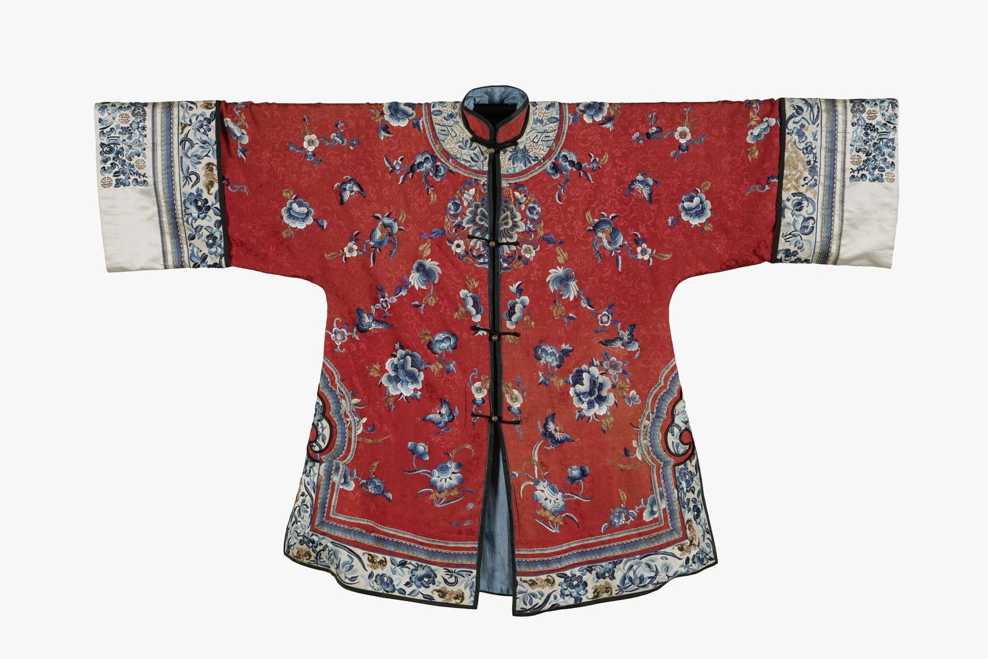 Soie brodée à décor de fleurs sur fond rouge, H 95 cm