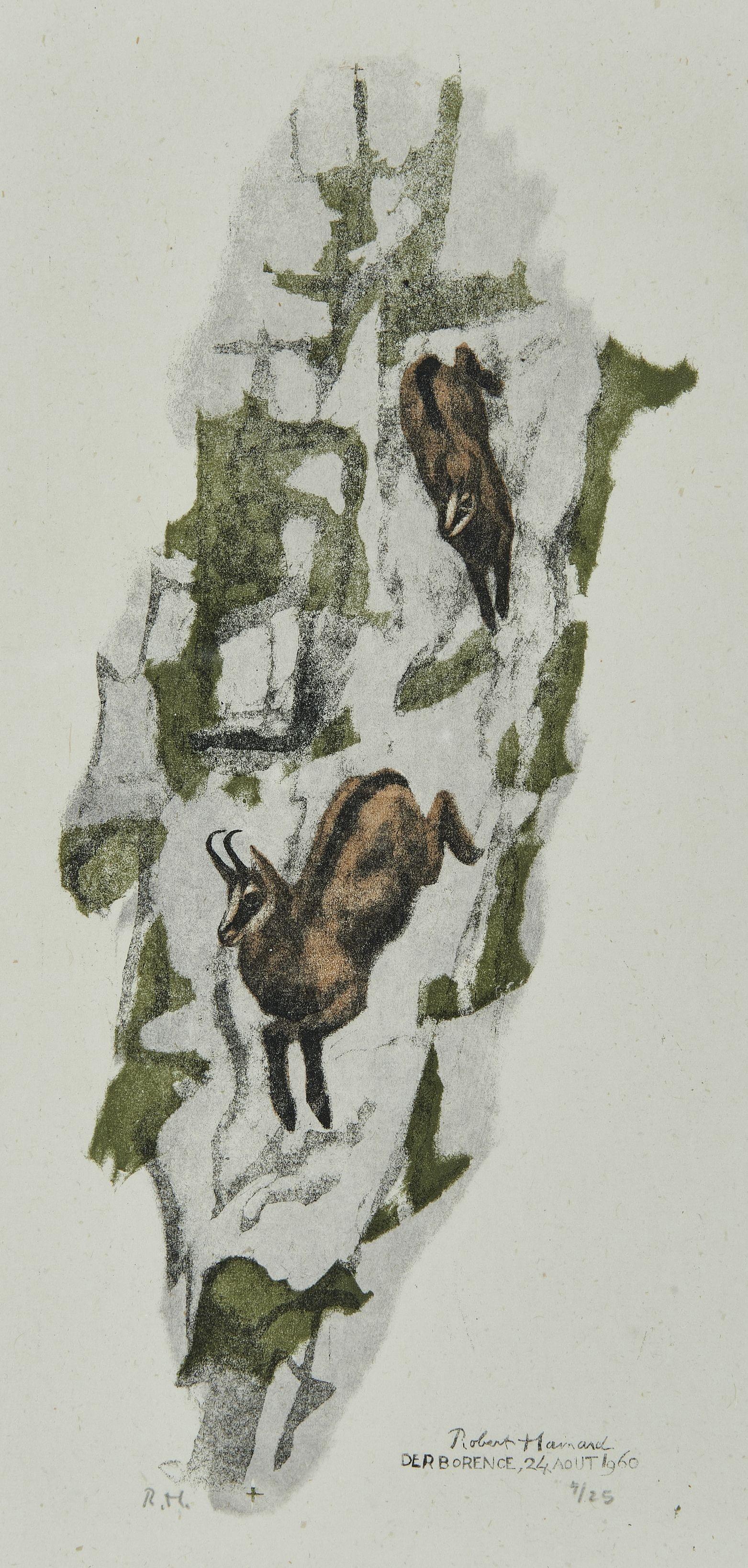 Chamois, femelle et jeune dévalant, Derborence, 24 août 1960, bois gravé, signé et numéroté 7/25, 38x24 cm