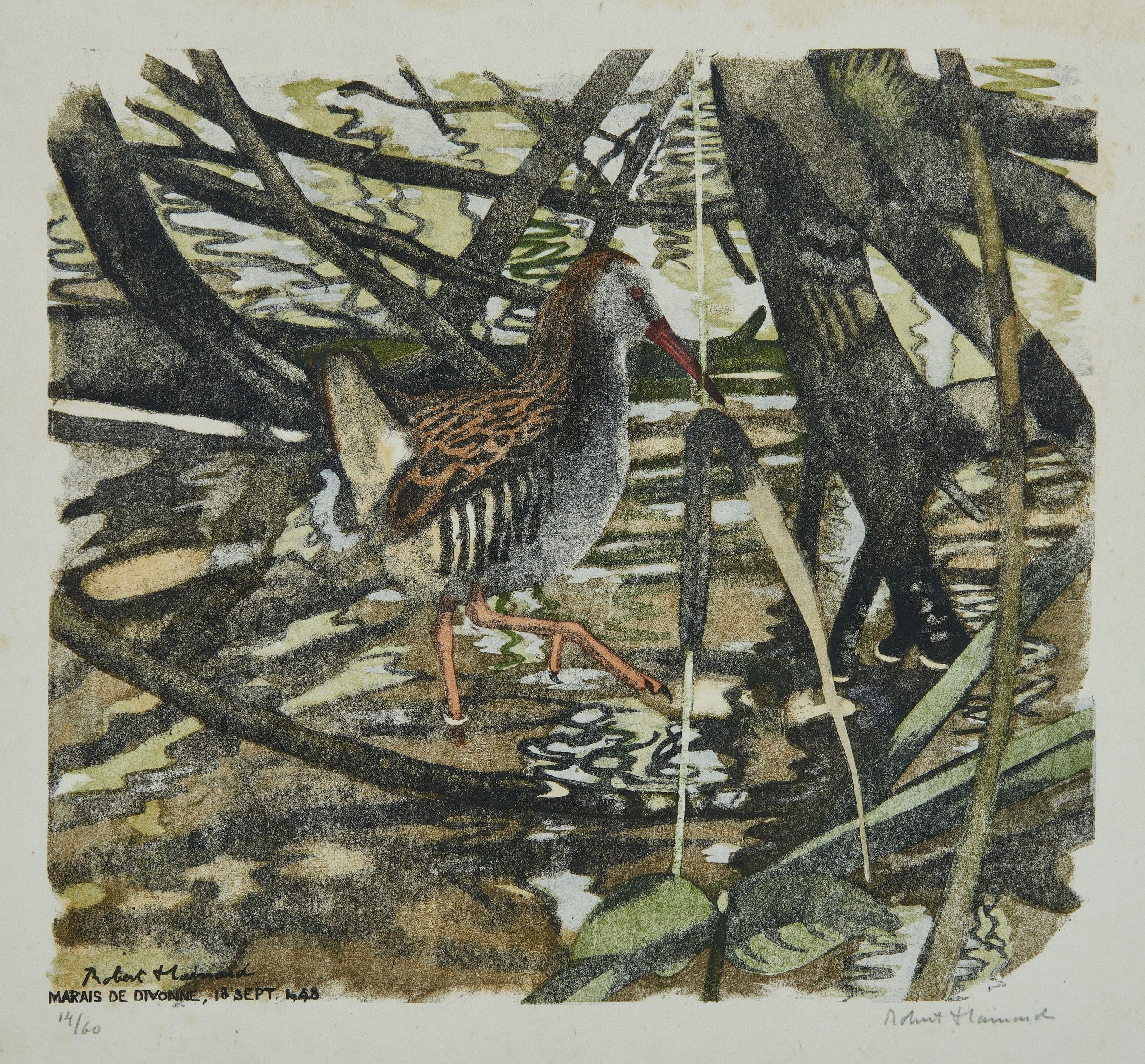 Râle d'eau, Marais de Divonne, 18 sept.1948, bois gravé, signé et numéroté 14/60, 25x26,5 cm