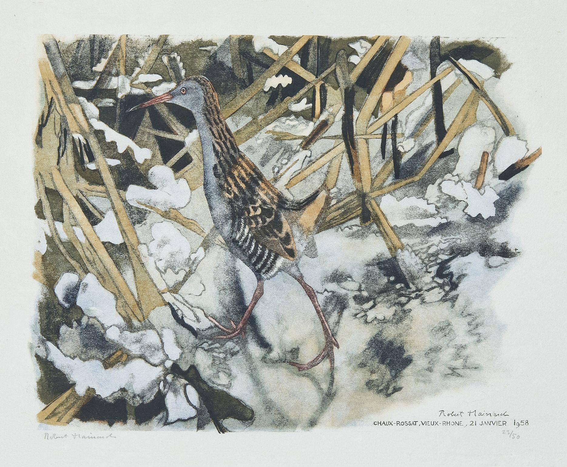 Râle sur la glace, Chaux-Rossat, Vieux-Rhône, 21 janvier 1958, bois gravé, signé et numéroté 23/50, 27,5x35,5 cm