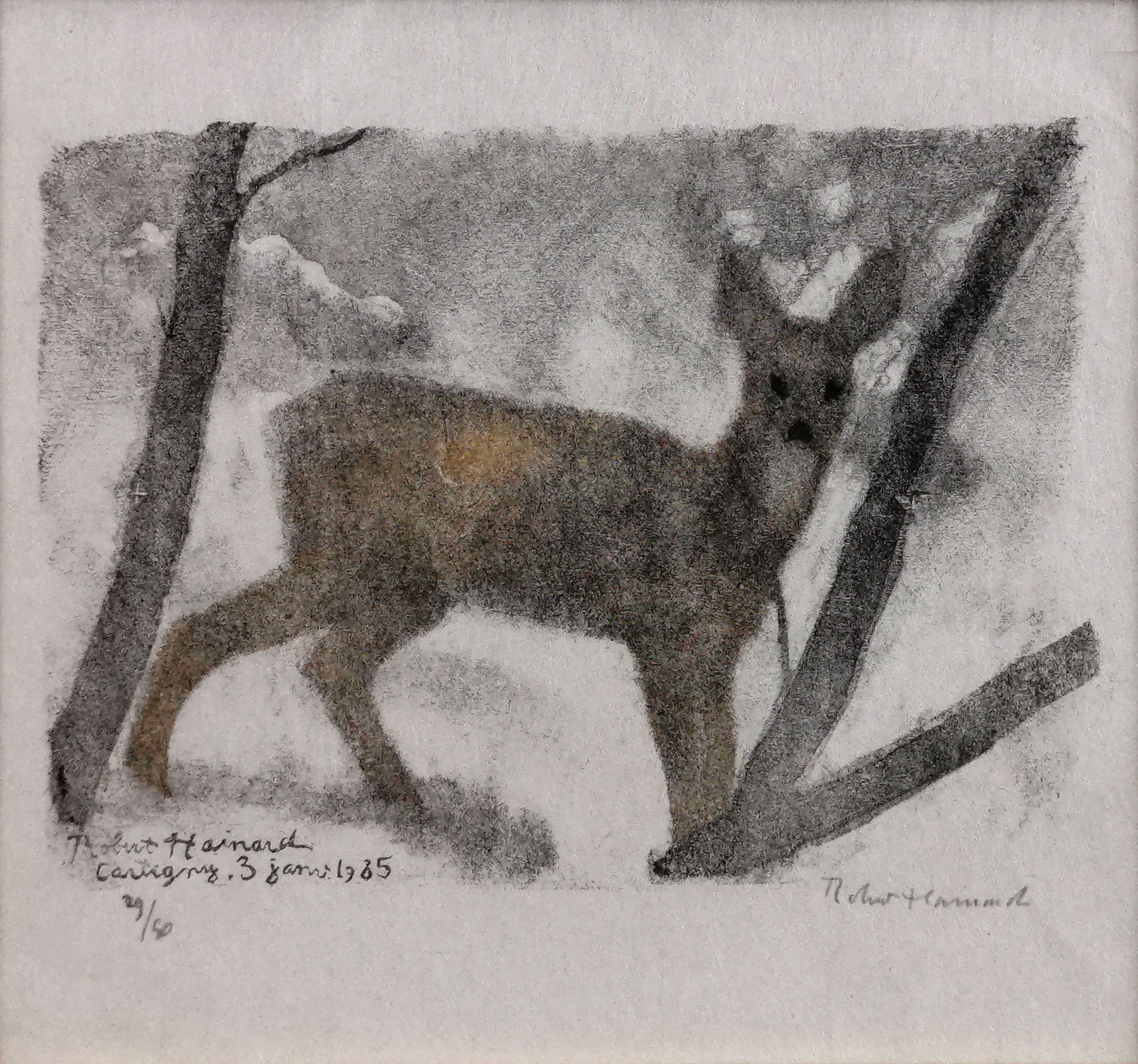 Chevrette à la tombée de la nuit, Cartigny, 3 janv. 1985, bois gravé, signé et numéroté 29/50, 14x19,5 cm