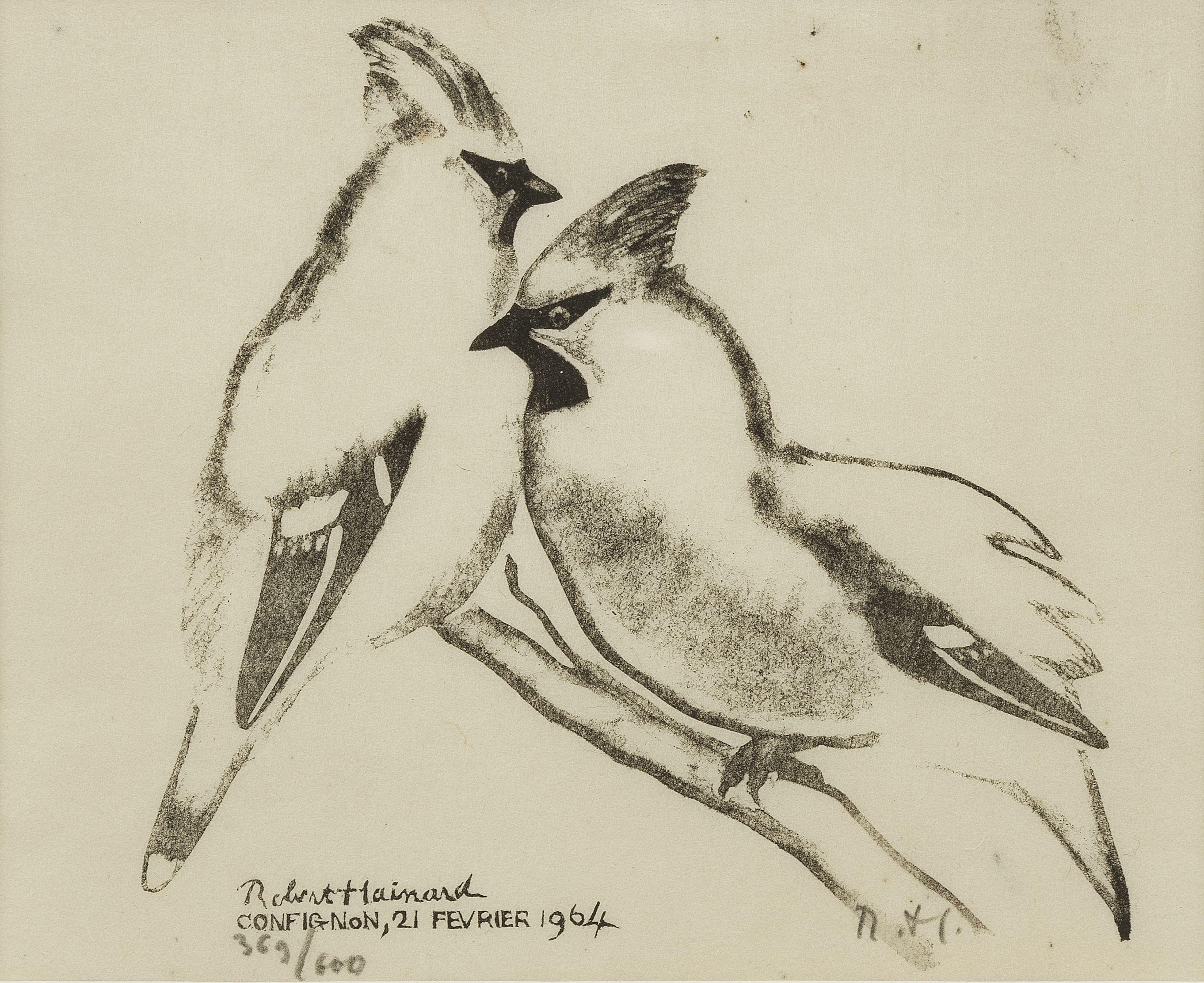 Deux jaseurs se faisant la cour, bois gravé, situé Confignon, daté 21 Février 1964, numéroté 369/600 et monogrammé, 13x16 cm