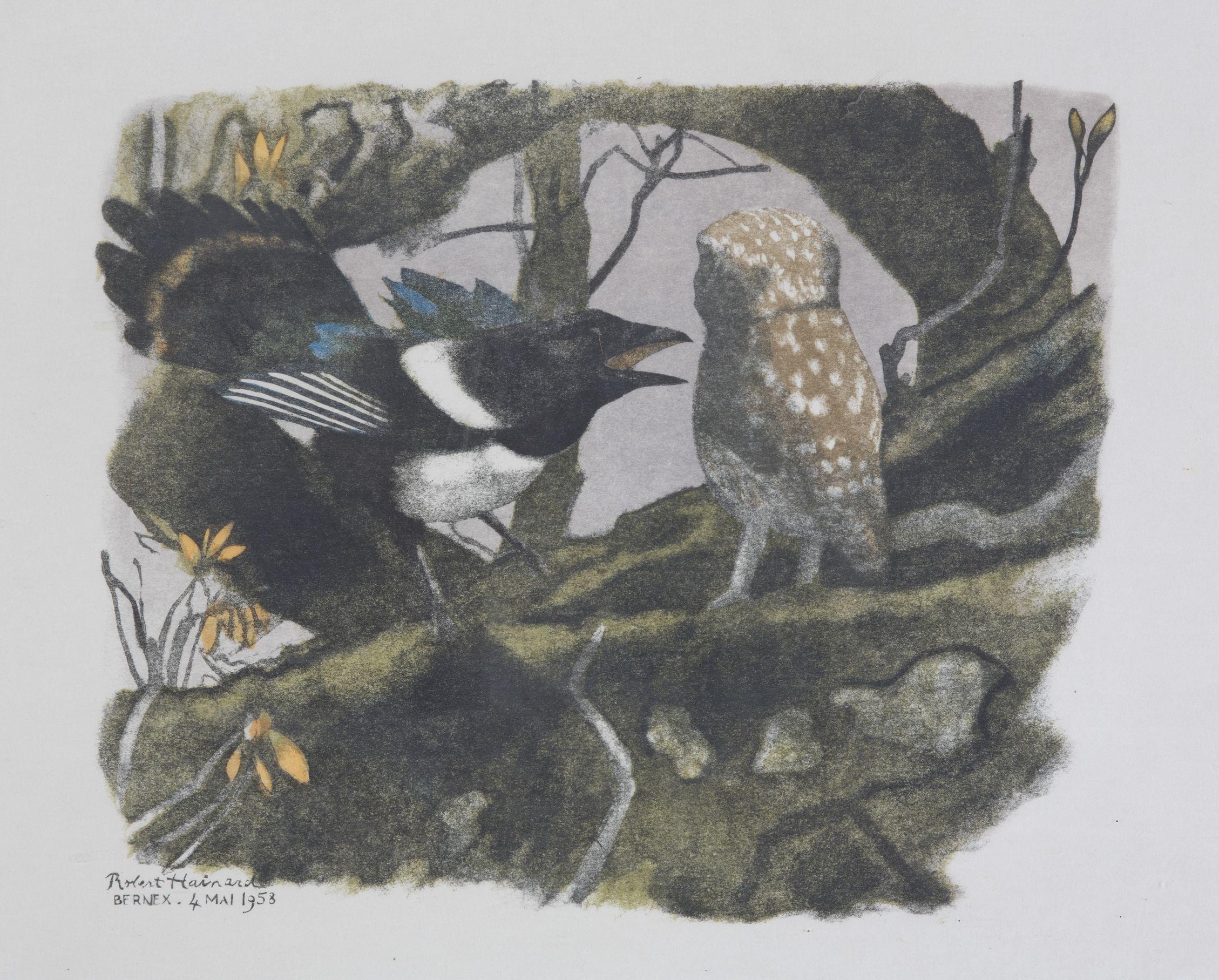 Pie et chouette, Bernex, 4 mai 1958, bois gravé non signé, 38x46 cm