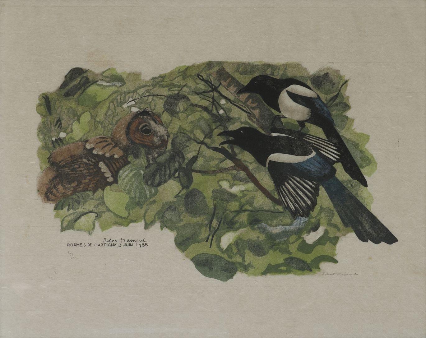 Chouette et pies, Roche de Cartigny, 3 juin 1955, bois gravé, signé et numéroté 39/45, 39x48 cm