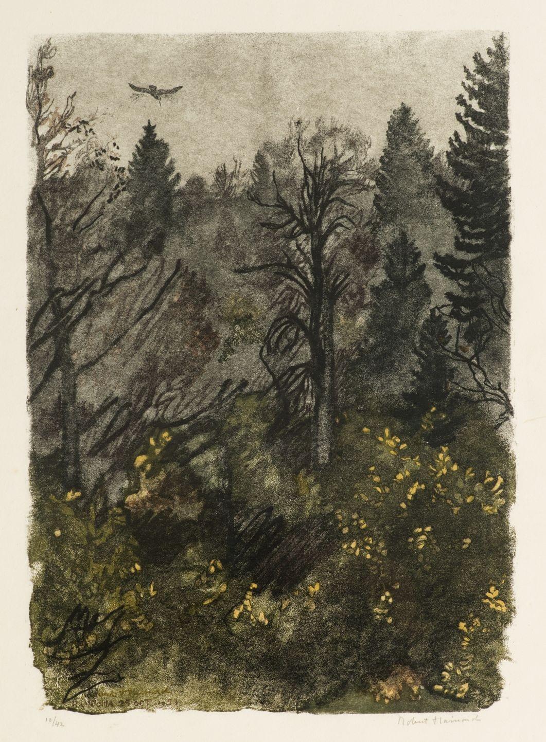 Sous-bois, bois gravé, signé et numéroté 10/42, daté 25 octobre 1951, 36x25 cm
