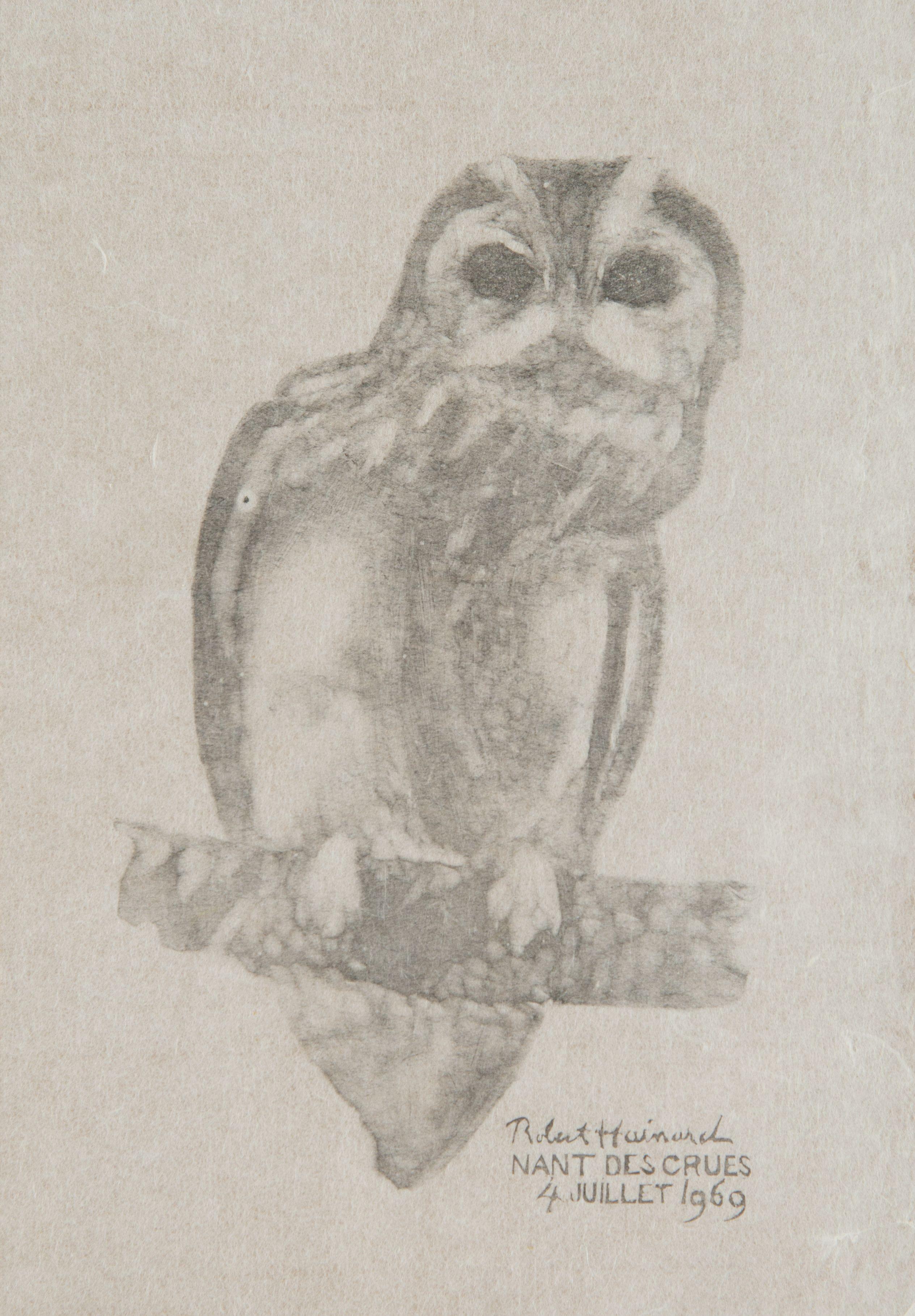 Couple de chouettes, Bernex, 8 févr. 1962, gravure sur bois, mon...