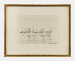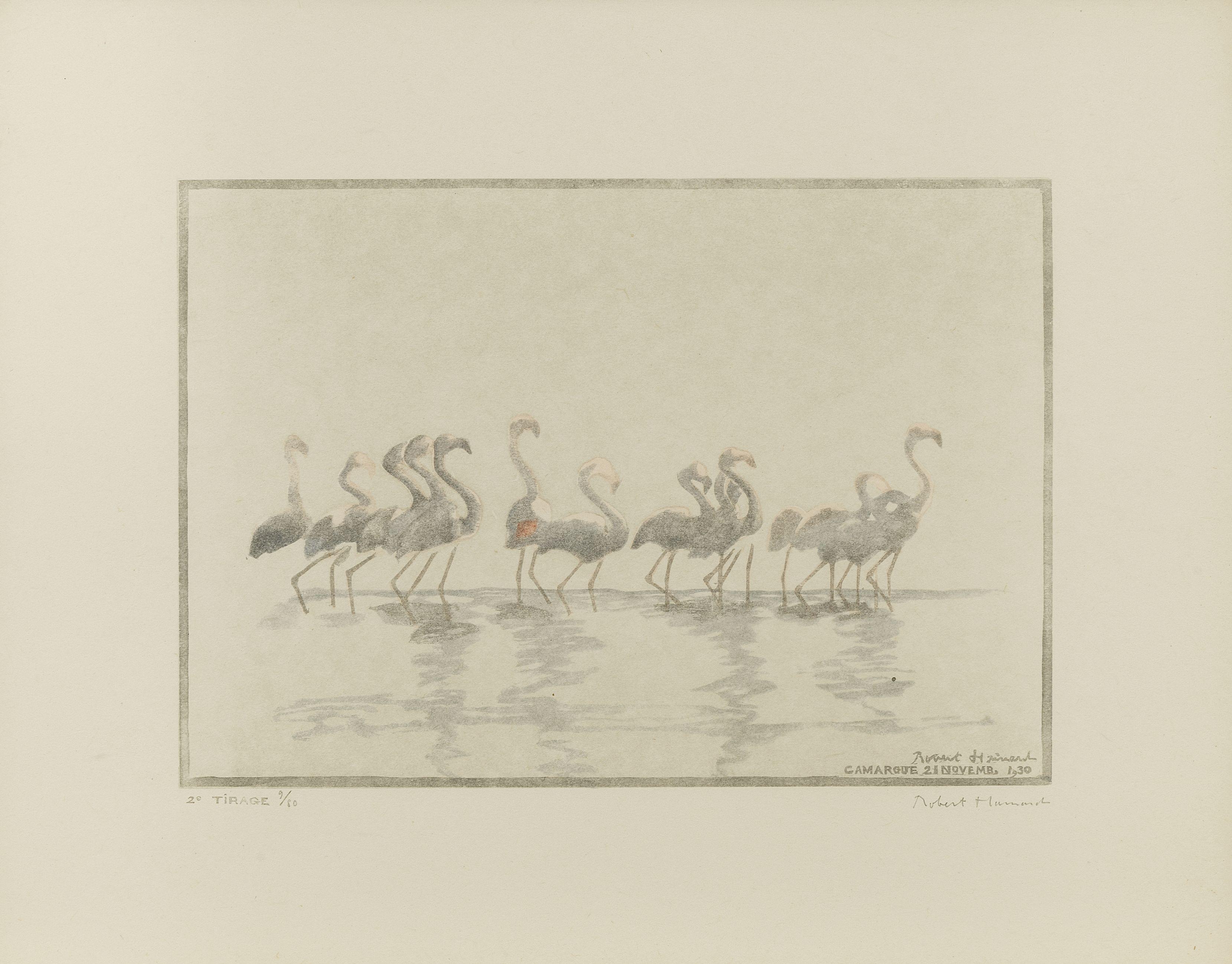 Flamants roses, bois gravé, situé Camargue, daté 21 novembre 1930, numéroté deuxième tirage 9/60 et signé, 15x20 cm