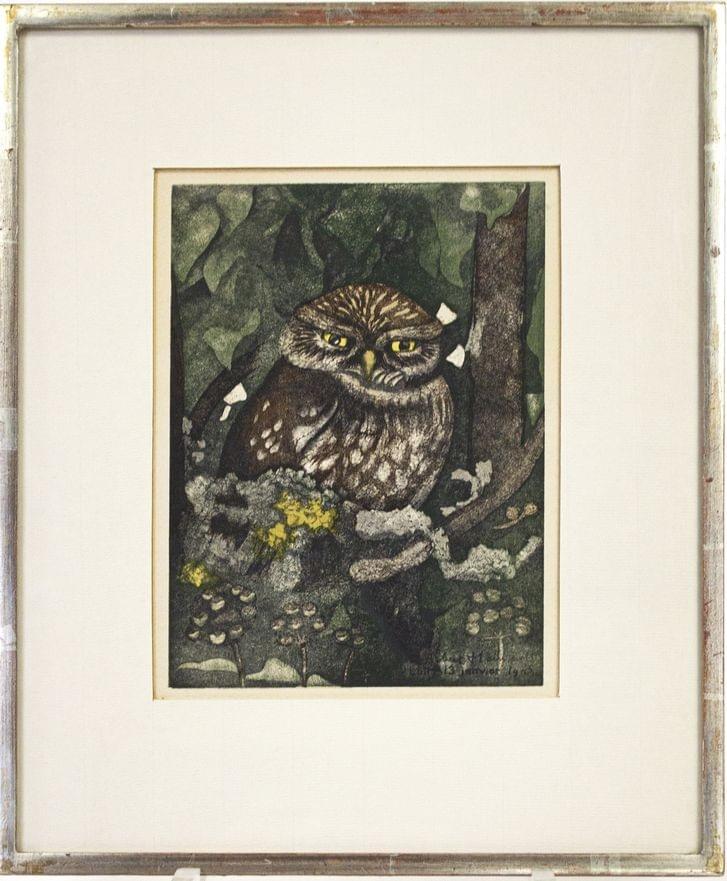 Chouette, bois gravé non signé, 21x16 cm