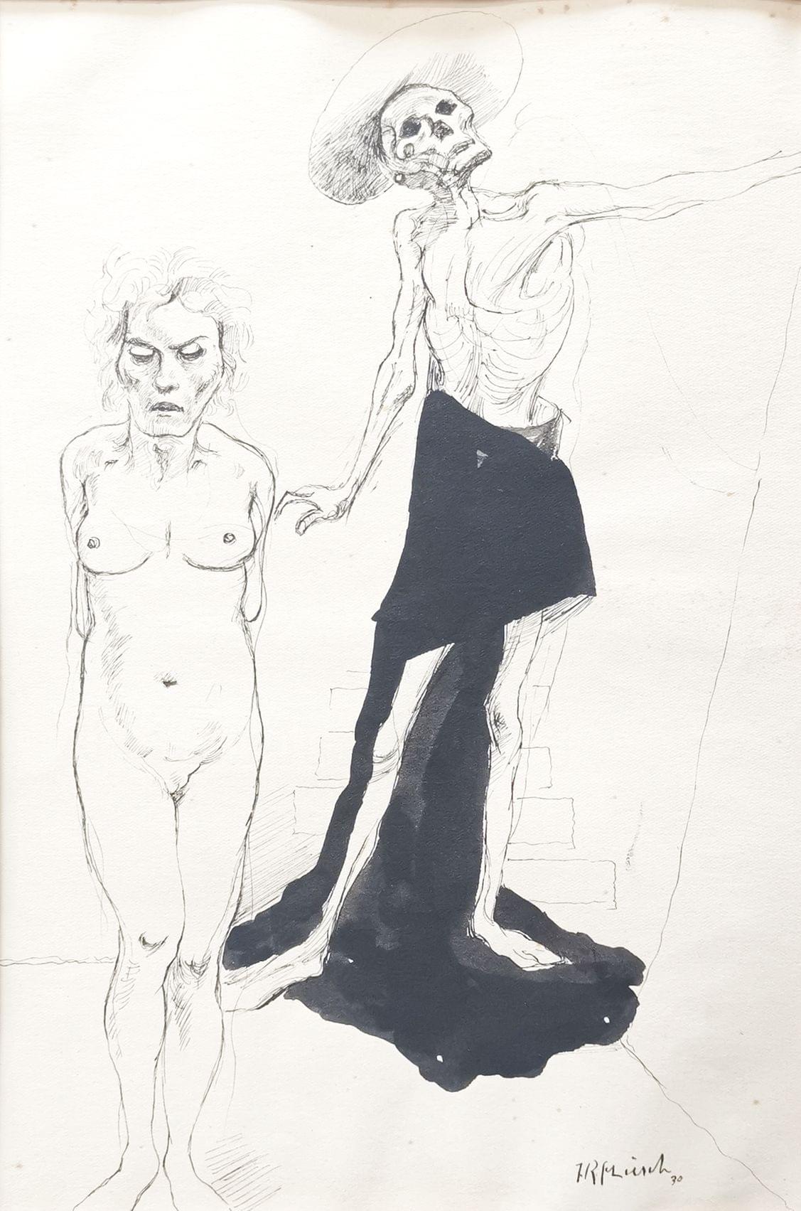La mort et la jeune fille, encre et aquarelle sur papier, signée et datée 30, 27x20 cm