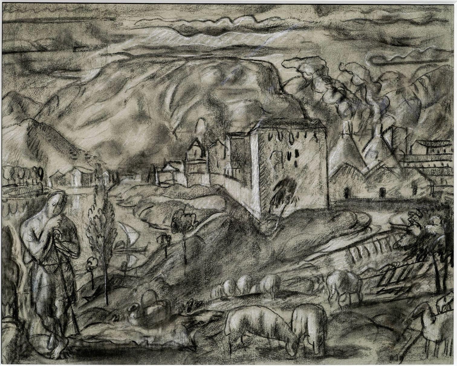 Paysage au berger et déjeuner sur l'herbe, deux fusains et craie blanche sur papier dos à dos, 40x49 cm